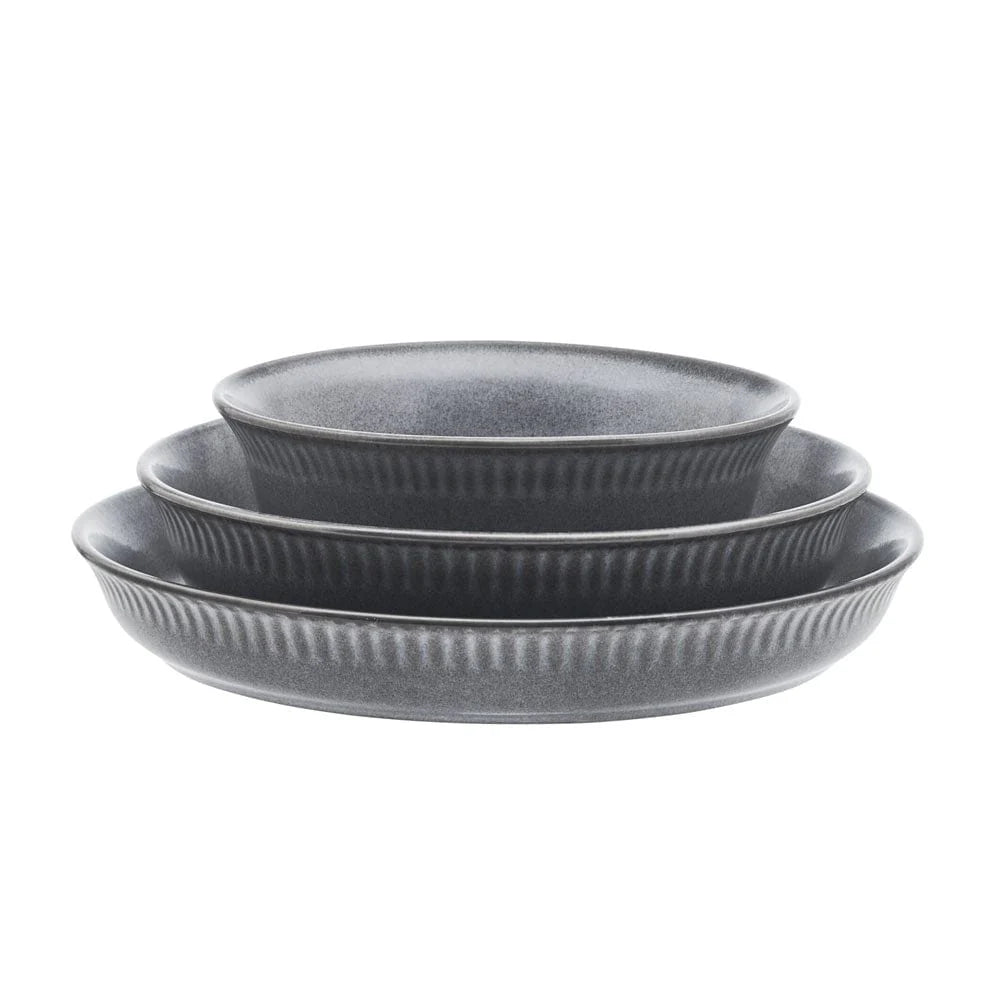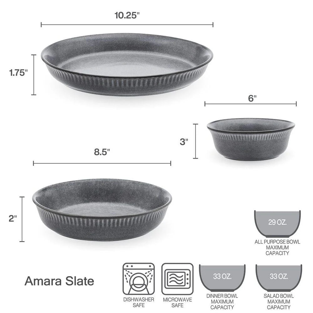 This Amara Slate Dinnerware Bowl set is specially designed for those that love bowls. Set features dinner bowls, pasta bowls and cereal bowls in contemporary shapes with a semi-matte, reactive glaze finish for a modern look and feel. Due to the nature and hand-crafted qualities of reactive glaze, no two pieces are exactly alike and will exhibit unique variations in color and pattern. Product may slightly differ from image shown.
