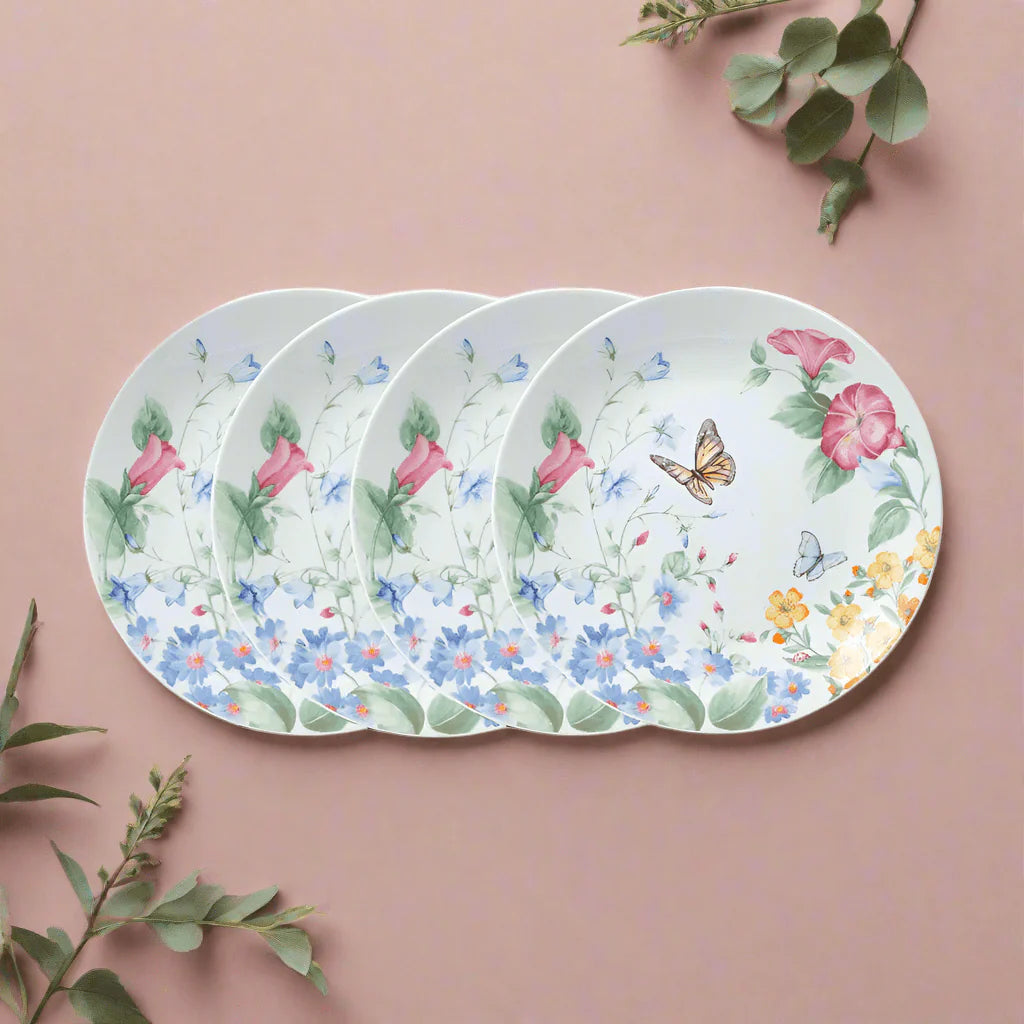 This Set of 4 Salad Plates are great for salads, but they can also be used for a sandwich and chips, dessert or a snack. Crafted of porcelain. Microwave and dishwasher safe. Set of 4 salad plates, each measures 8 inch diameter.