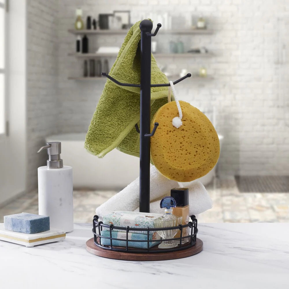 This Anvil Cage Mug Tree is perfect for keeping mugs neat, conveniently within reach, and easily accessible. The black wire design and natural wood platform will complement any decor.