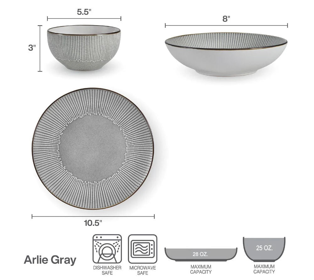 This Pfaltzgraff Arlie Gray Dinnerware Set features an embossed pattern, accented with a metallic rim, and a bold color reactive glaze finish. Due to the nature and hand-crafted qualities of reactive glaze, no two pieces are exactly alike and will exhibit unique variations in color and pattern. Product may slightly differ from image shown.