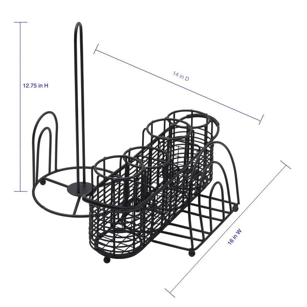 This Gourmet Basics Art Deco Hostess Buffet Storage Caddy features a contemporary black finish that complements most decors. The wire frame design provides clear visibility of the contents, and the caddy features 4 compartments to keep utensils divided and organized, a slot for napkins, and a paper towel holder. Caddy has a convenient handle on top for carrying.