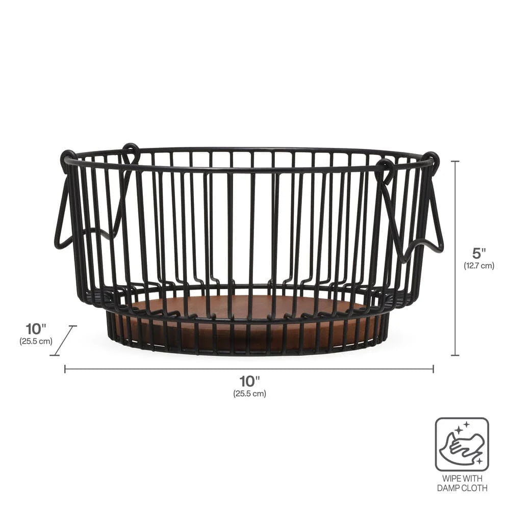 From the Gourmet Basics by Mikasa Collection, this Ashford Centerpiece Fruit Storage Basket features a wire-framed design allowing air to circulate through the breathable cage, so produce can evenly ripen. The black finish and natural wood platform will complement any decor.