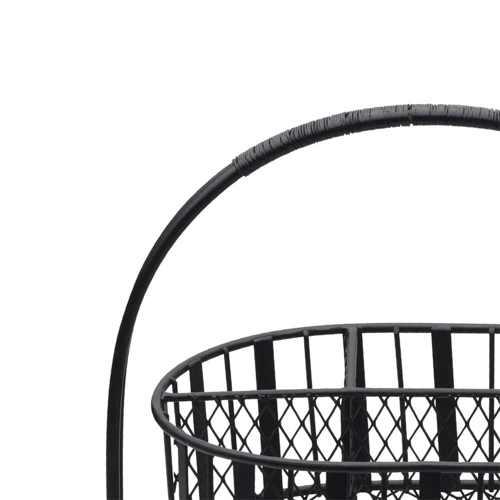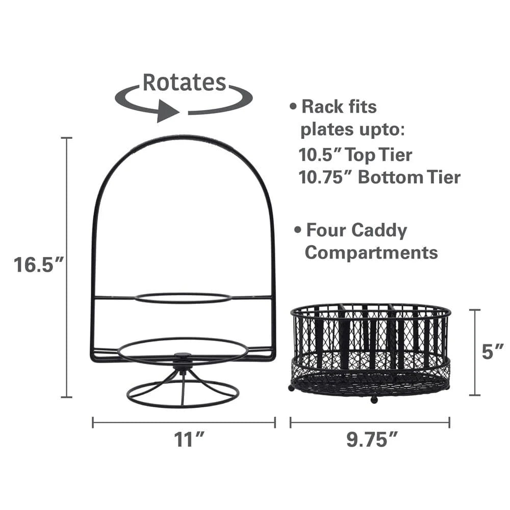 This Gourmet Basics Band and Stripe Swivel Hostess Buffet Storage Caddy features a contemporary black finish that complements most decors. The wire frame design with thick band accents provides clear visibility of the contents, and the caddy features compartments to keep utensils, plates, and napkins grouped together, organized, and separated. Caddy has a convenient handle on top for carrying.