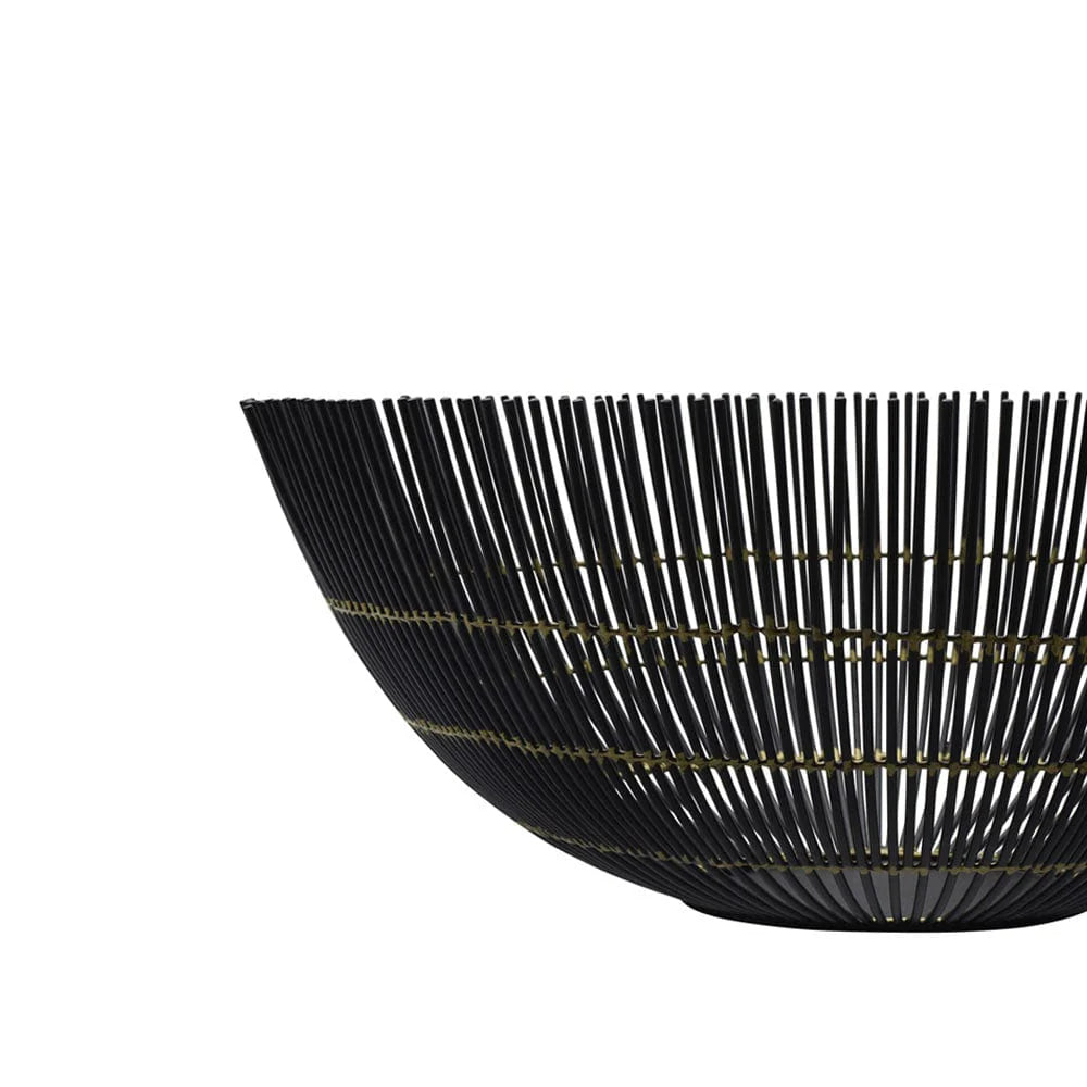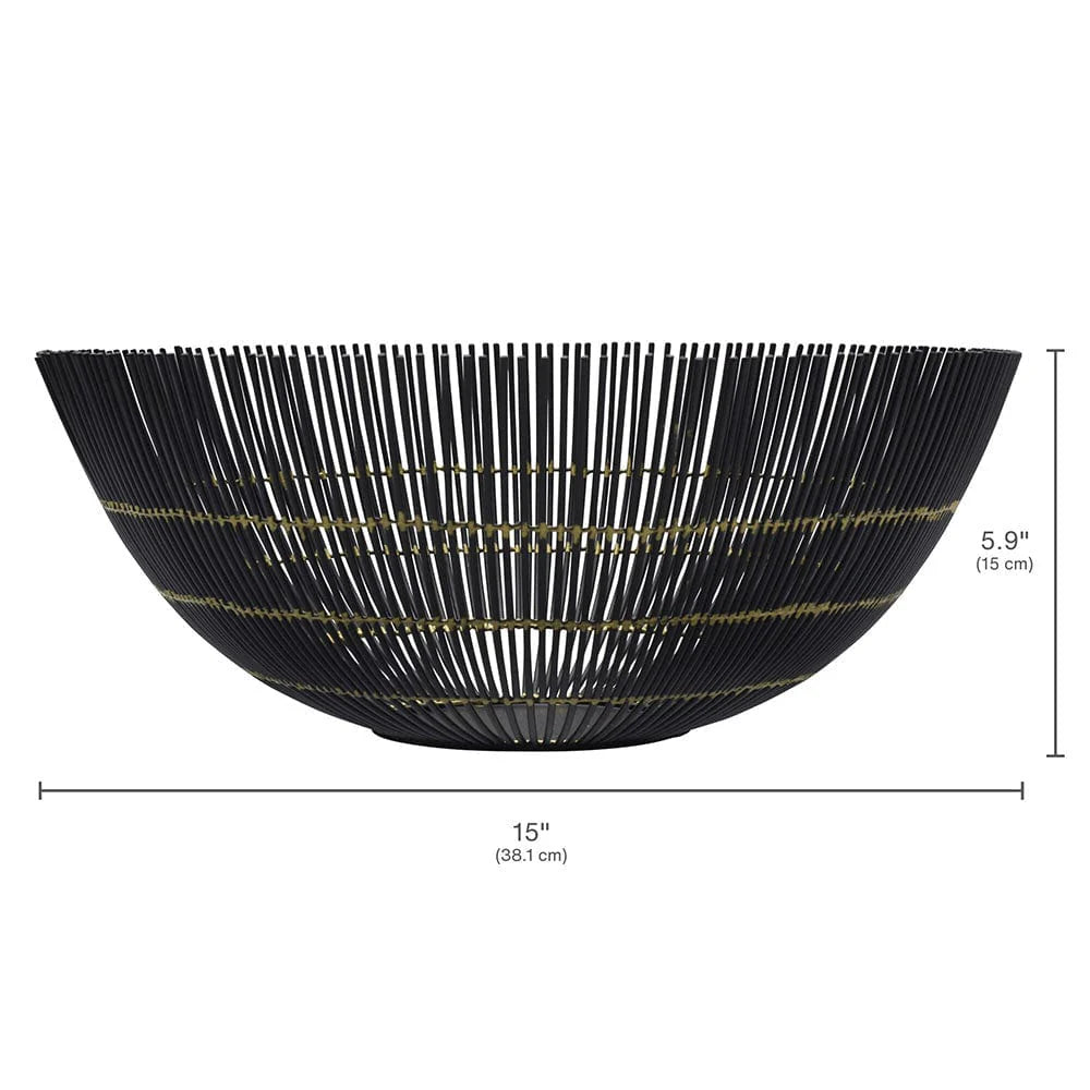 This Gourmet Basics Benson Centerpiece Basket features a black wire design, with delicate gold details that will add an elegant look to any room in your home. Air flows through the open-wire design allowing fruits to ripen evenly.