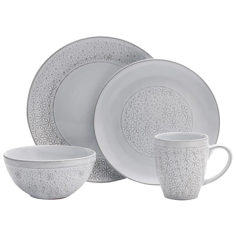 Crafted of stoneware. 16 piece dinnerware set, service for four, includes (4) each: 11 inch dinner plate, 8 inch salad plate, 6 inch soup cereal bowl and 12 ounce mug. Microwave and dishwasher safe.