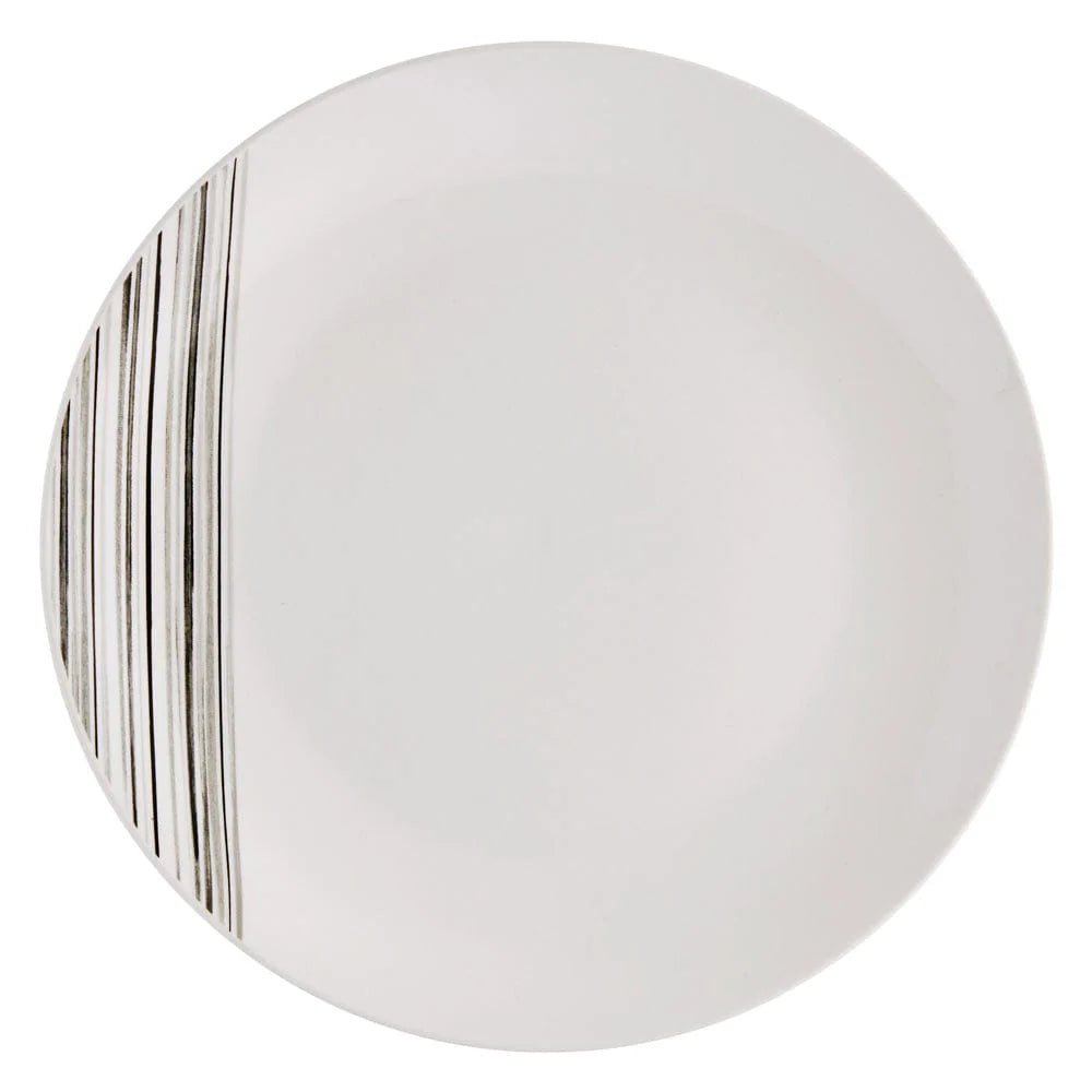 From the Studio Nova Brand, Brushed Lines Dinnerware captivates with a simple black brush stroke band running up one side of each crisp white piece, and will add a touch of sophistication to any dinner gathering.