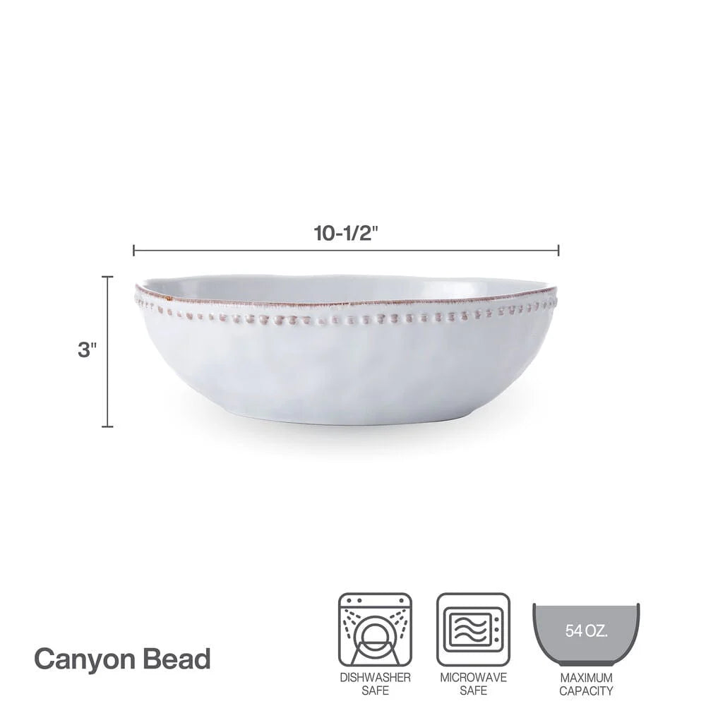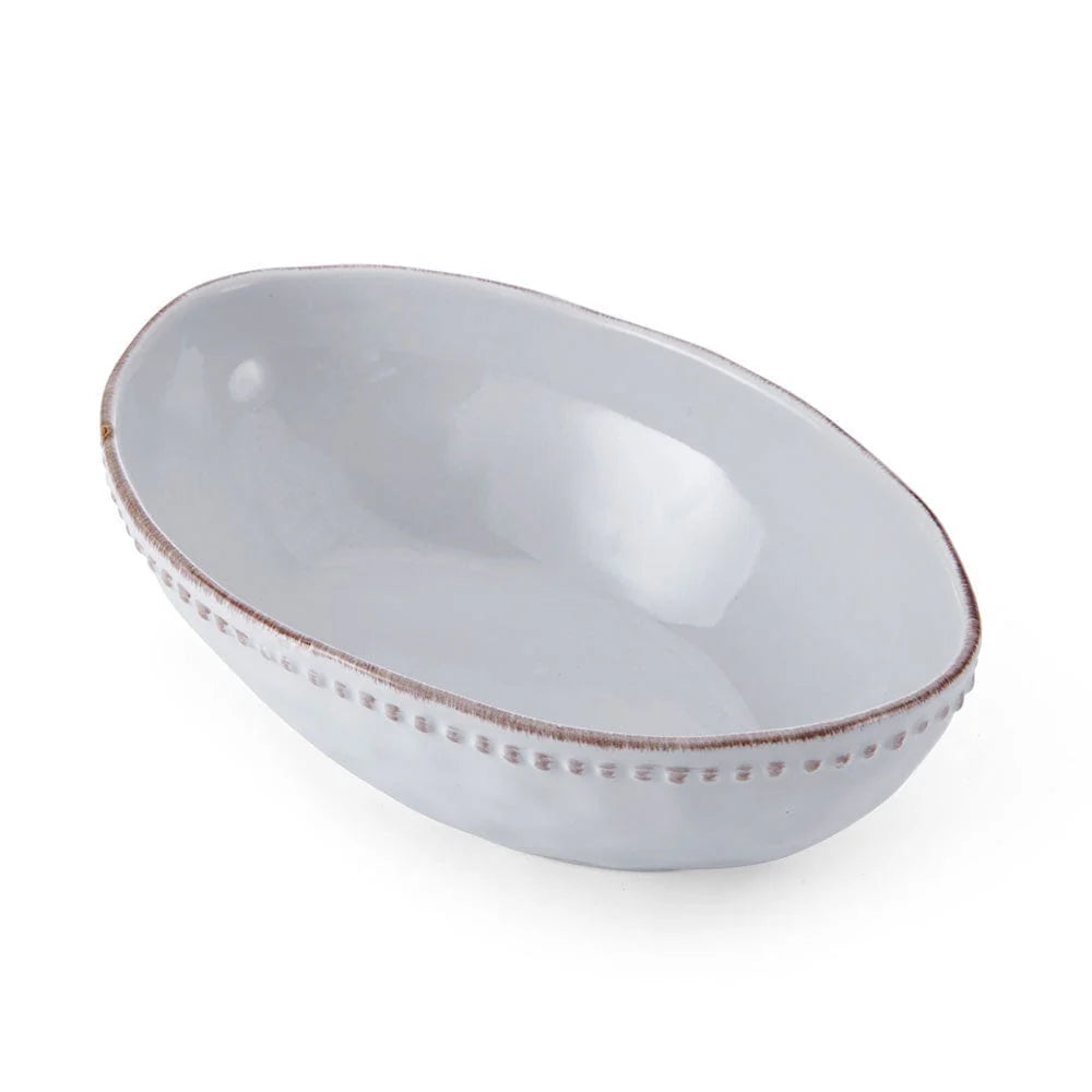 This Canyon Bead Oval Serve Bowl features a unique, warped shape, with large yet subtle dents on the surface, and a beaded band encircling the rim, adding a rustic and contemporary accent to your table.