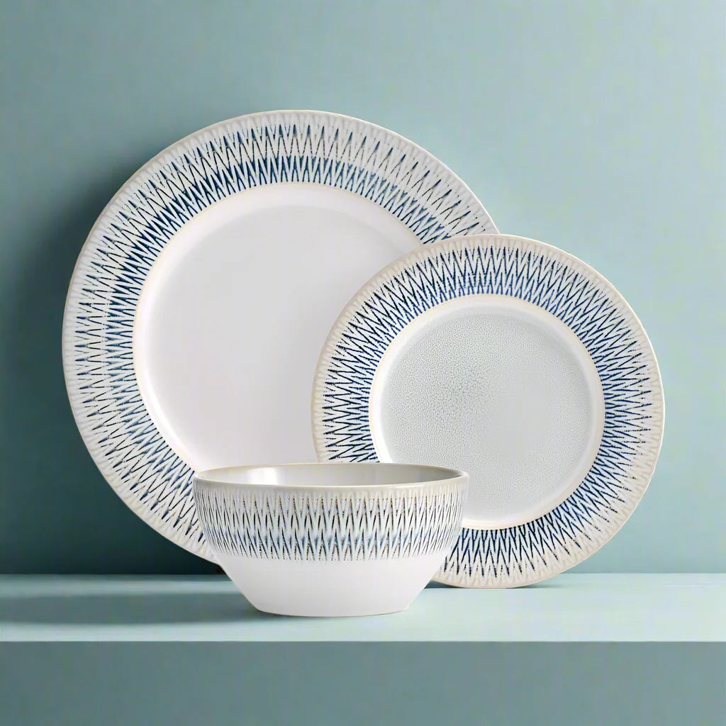 This Casey Dinnerware Set features a cream center, with a thick blue and taupe embossed border, on a reactive glaze finish. Due to the nature and hand-crafted qualities of reactive glaze, no two pieces are exactly alike and will exhibit unique variations in color and pattern. Product may slightly differ from image shown.