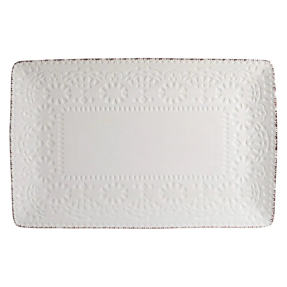 This Chateau Cream Rectangular Platter features a scalloped edge with a subtle antiqued accent color, and a debossed, delicate lace-inspired design on the surface, and a hint of red along the scalloped edge, bringing the spirit of country manor living to your home.