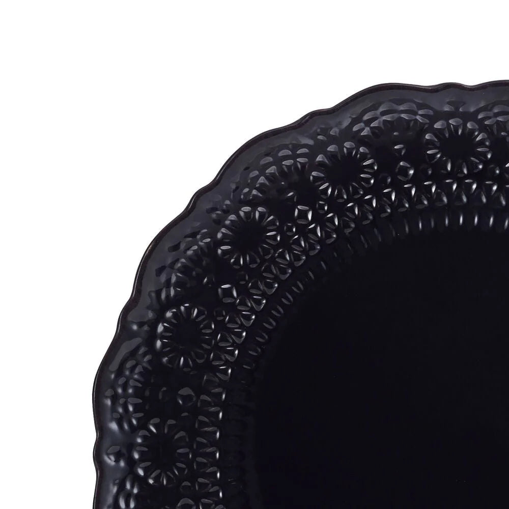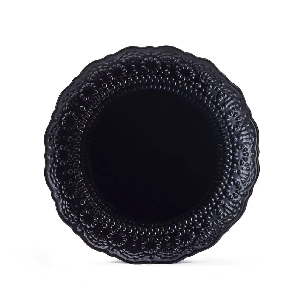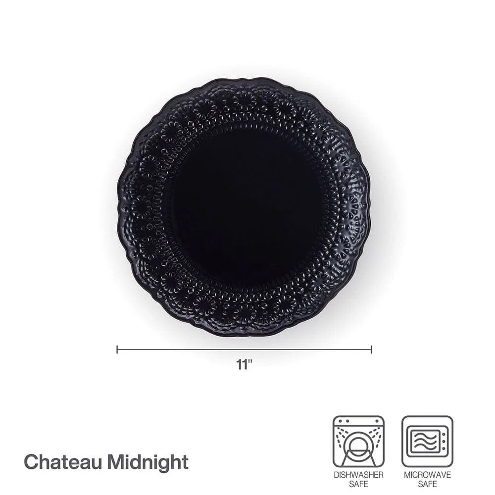 This Chateau Midnight Set of 4 Dinner Plates feature a simple, versatile midnight backdrop, with an intricate lace inspired design that circles the plate. The elegant look is enhanced with antiquing around the rim and scalloped edges, the result is a timeless, regal design that adds a classic touch to a modern table.