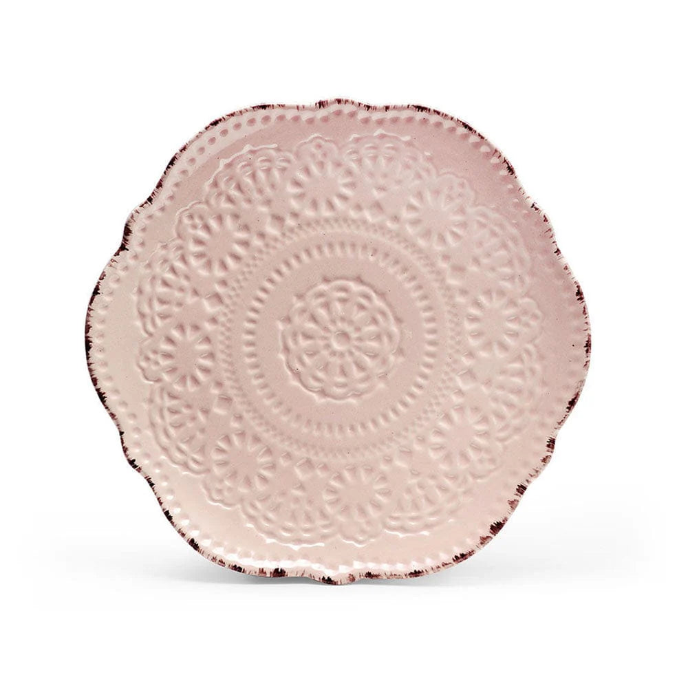 This Chateau Pink Set of 4 Salad Plates feature a simple, versatile pink backdrop, with an intricate lace inspired dimpled pattern that circles the plate. The elegant look is enhanced with antiquing around the rim and scalloped edges, the result is a timeless, regal design that adds a classic touch to a modern table.