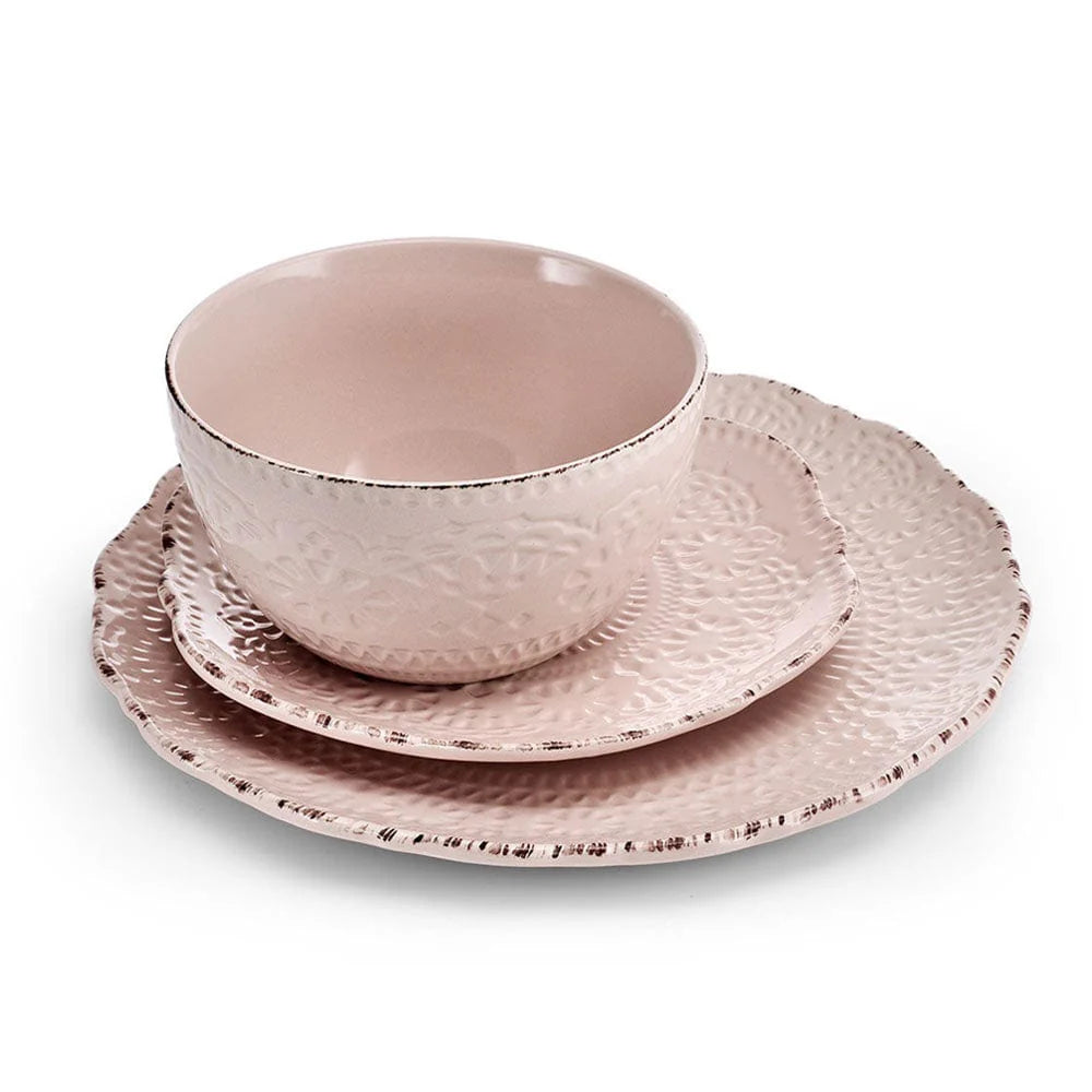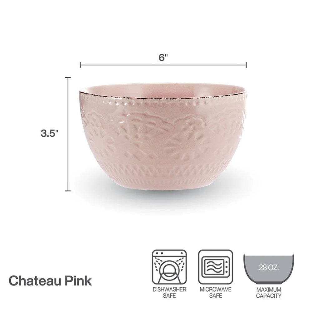 This Chateau Pink Set of 4 Soup Cereal Bowls feature a simple, versatile pink backdrop, with an intricate lace inspired dimpled pattern that circles the bowl. The elegant look is enhanced with antiquing around the rim and scalloped edges, the result is a timeless, regal design that adds a classic touch to a modern table.