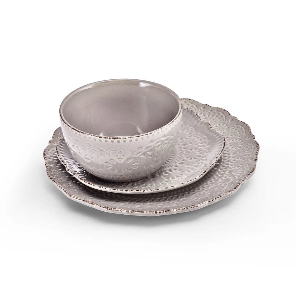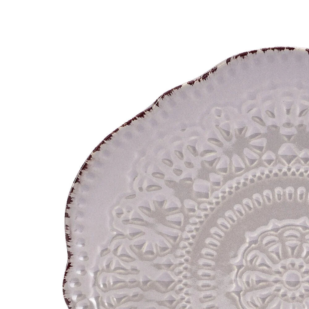 This Chateau Smoke Dinnerware Set features a simple, versatile smoke backdrop, with an intricate lace inspired design that circles each piece. The elegant look is enhanced with antiquing around the rim, and scalloped edges, the result is a timeless, regal design that adds a classic touch to a modern table.