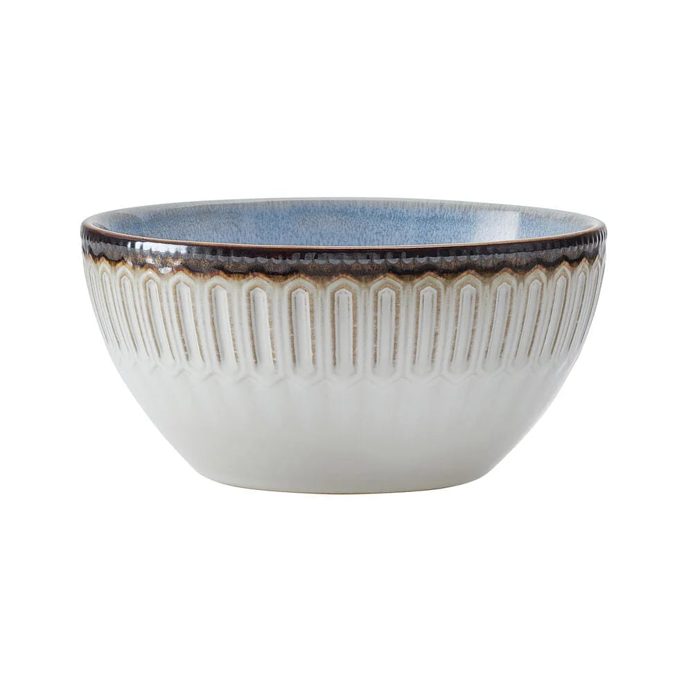 This Clara Dinnerware Set features a bright color palette, with contrasting patterns on the rims and centers in shades of tan and blue, and a reactive glaze finish. Due to the nature and hand-crafted qualities of reactive glaze, no two pieces are exactly alike and will exhibit unique variations in color and pattern. Product may slightly differ from image shown.