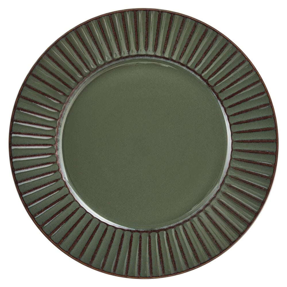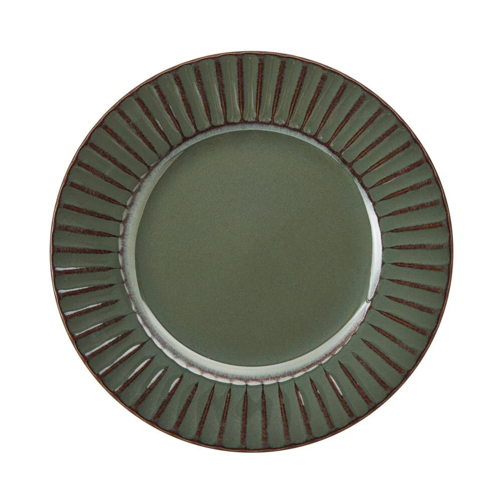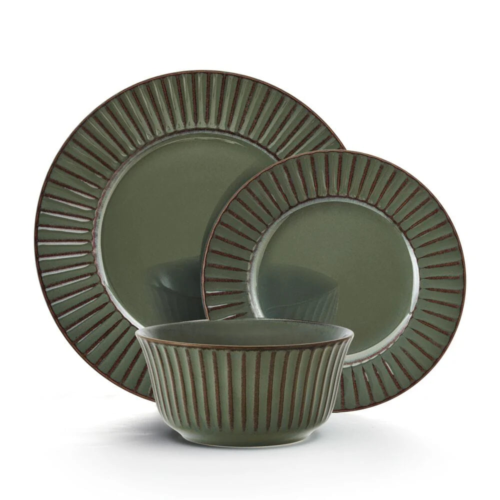 This Dannie Green Dinnerware Set features an embossed line pattern around each piece, with a sleek, rich color, on a reactive glaze finish. Due to the nature and hand-crafted qualities of reactive glaze, no two pieces are exactly alike and will exhibit unique variations in color and pattern. Product may slightly differ from image shown.