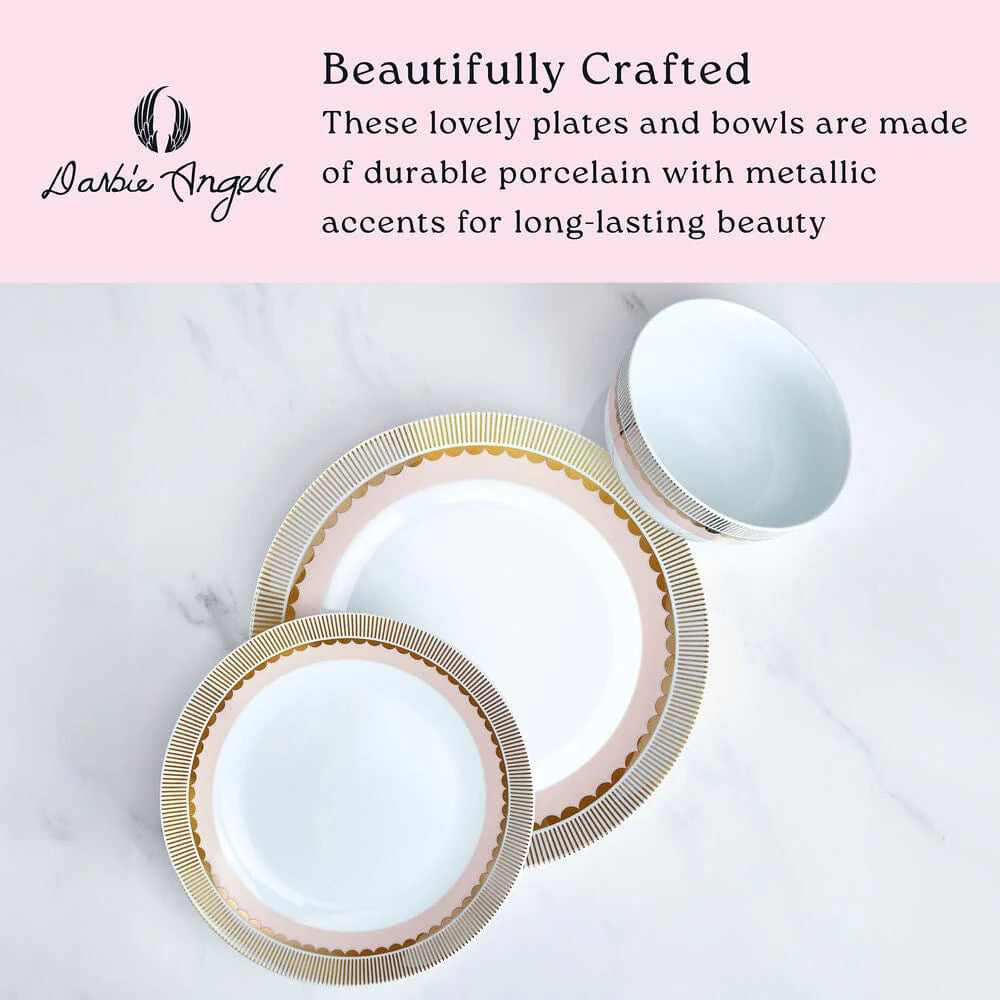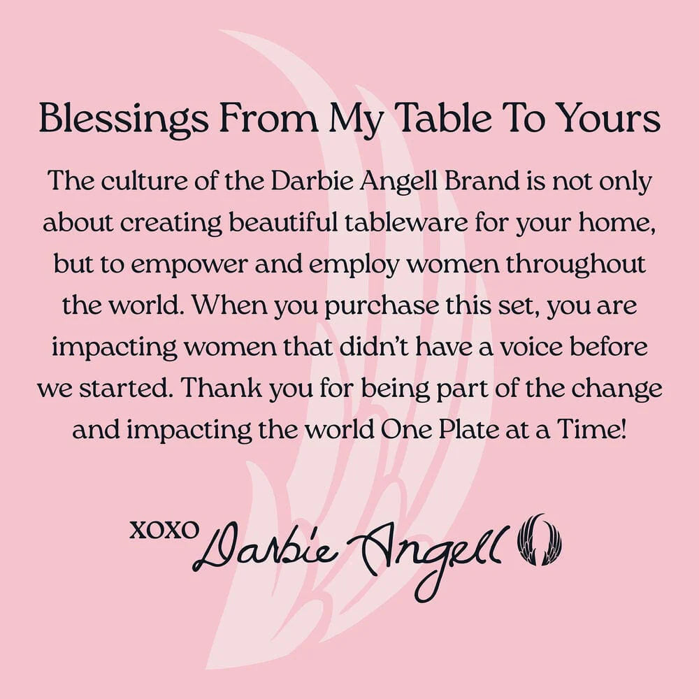 The Darbie Angell Brand not only creates beautiful tableware for your home, but empowers and employs women throughout the world, aiming to impact lives one table setting at a time. Entertain in style with this 12-Piece Blush Golden Charm Dinnerware Set. These stylish dinnerware pieces are adorned with lustrous gold and blushing pink details that bring a dazzling elegance to tables, making them perfect for both everyday dinners and special occasions.