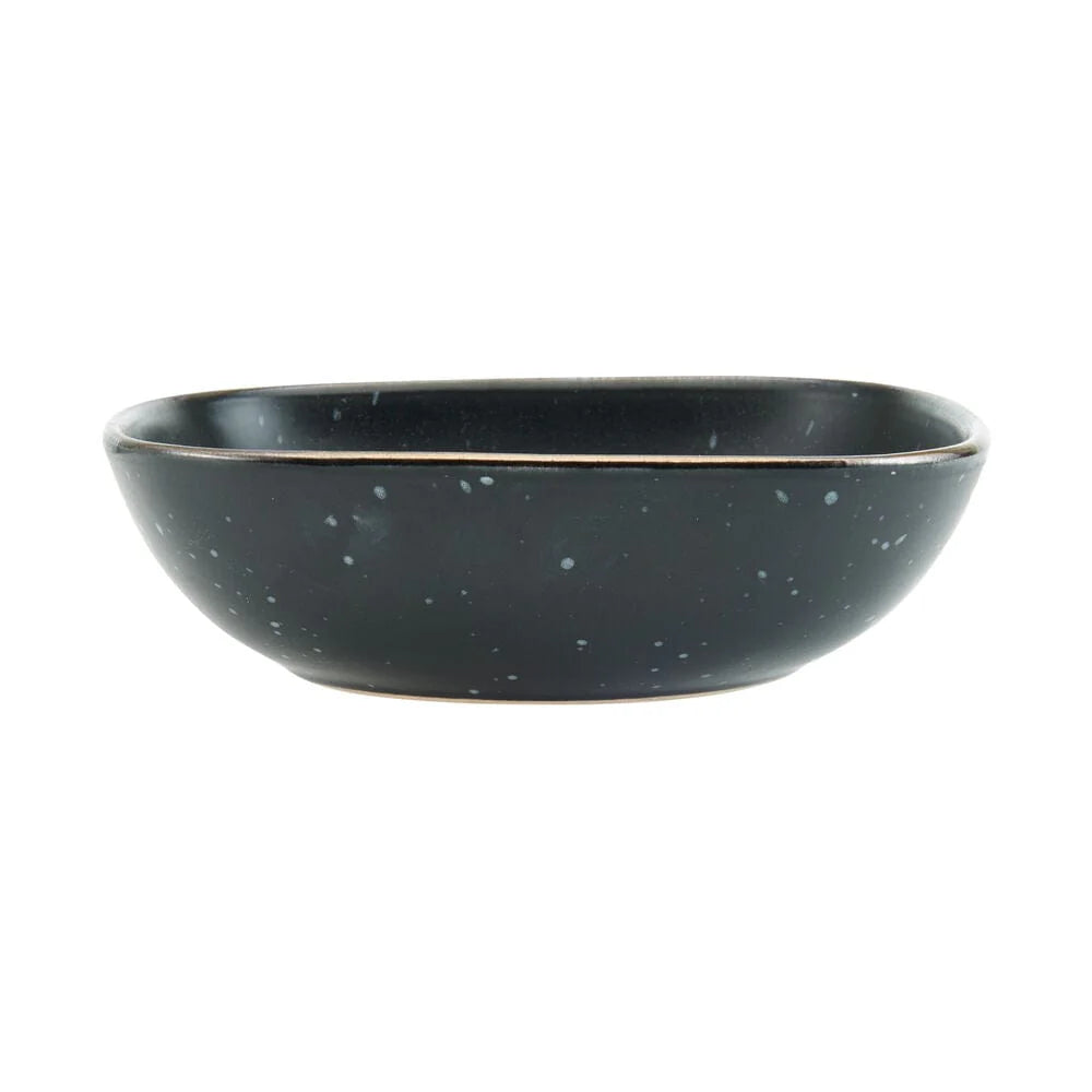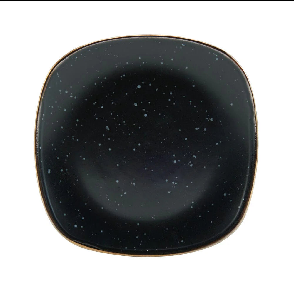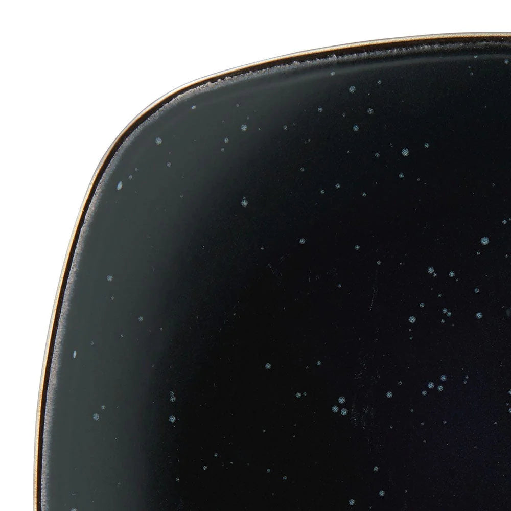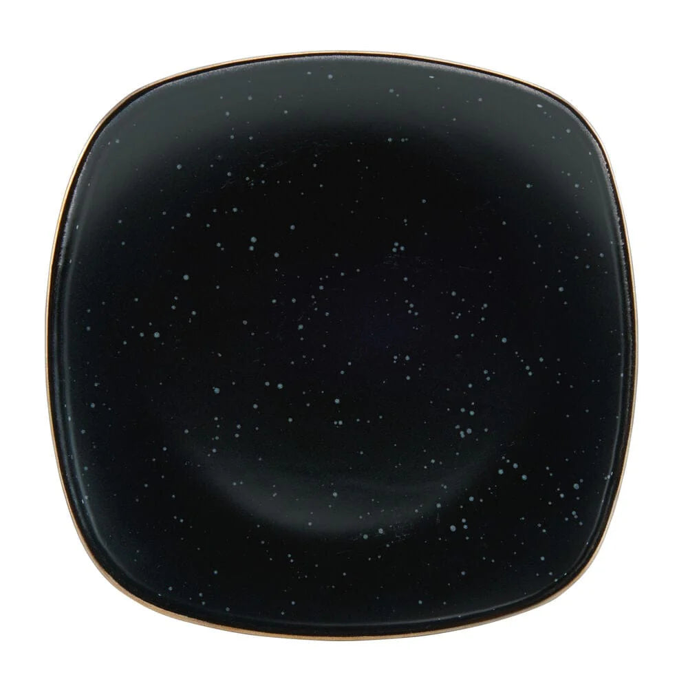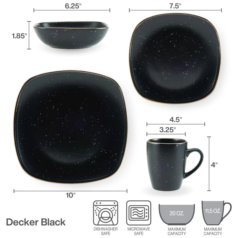 This Pfaltzgraff Decker Black Dinnerware Set features square shaped pieces with gently curved corners. The deep black bodies are adorned with a mesmerizing speckle effect, and highlighted with metallic rims.