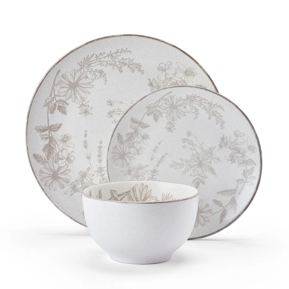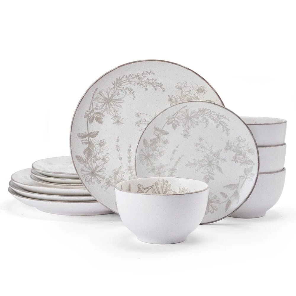 Enliven your tabletop with the floral elegance of this 12-Piece Enchanted Bloom Dinnerware Set. Beautifully crafted of high-quality stoneware for strength and durability, this captivating collection features a bold, botanical-inspired pattern that brings a touch of garden charm to mealtime. The eye-catching, gray flower and rim design makes a striking statement on a contemporary tabletop and is perfect for everyday dining or casual entertaining.