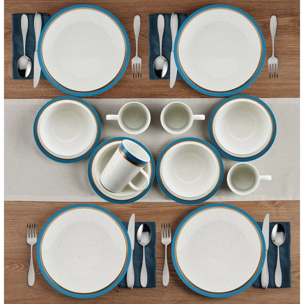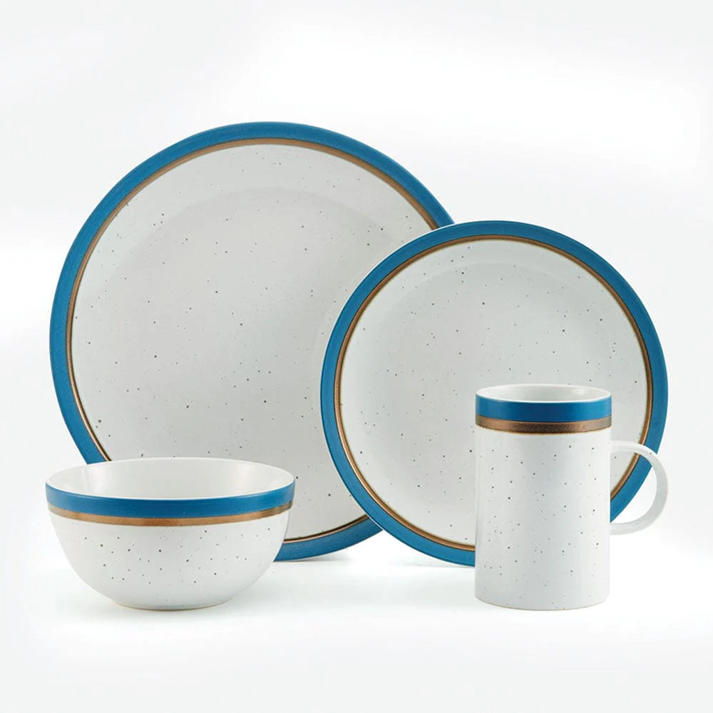 This Pfaltzgraff Ezra Blue Dinnerware Set features a speckle background pattern, with deep dark blue and metallic bands around the rim, adding a burst of color and modern allure to your everyday dining.