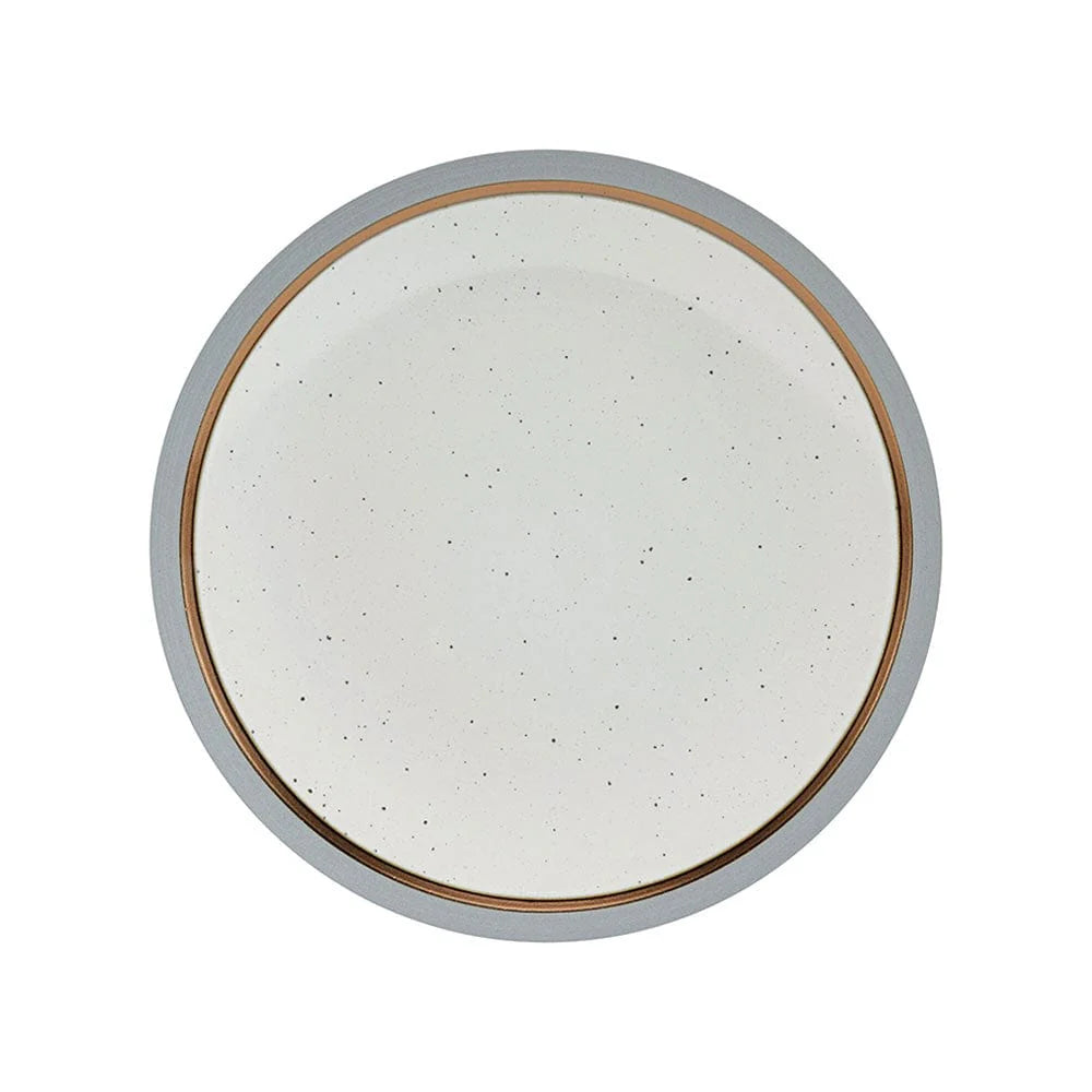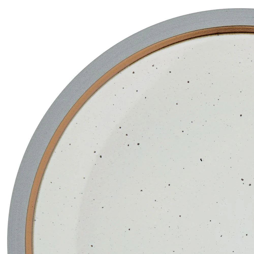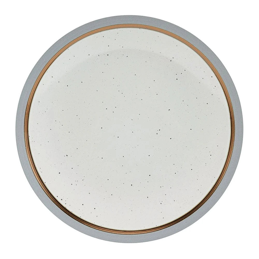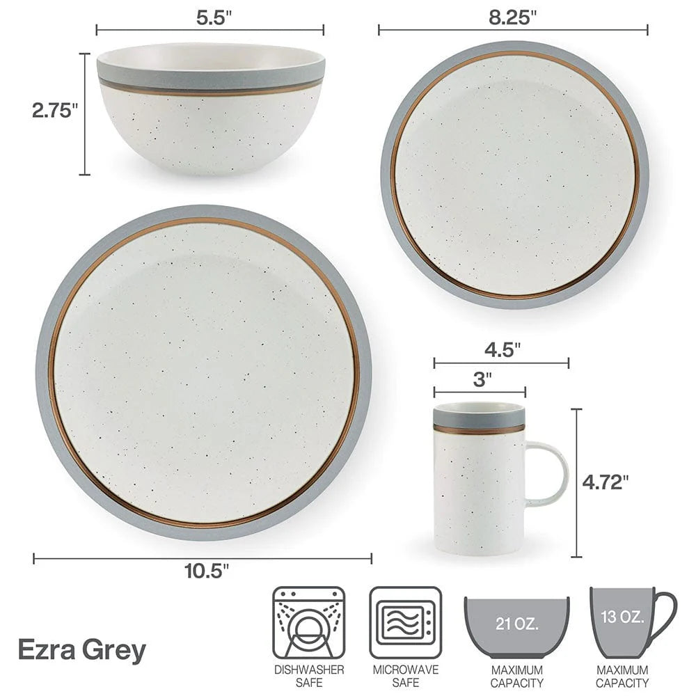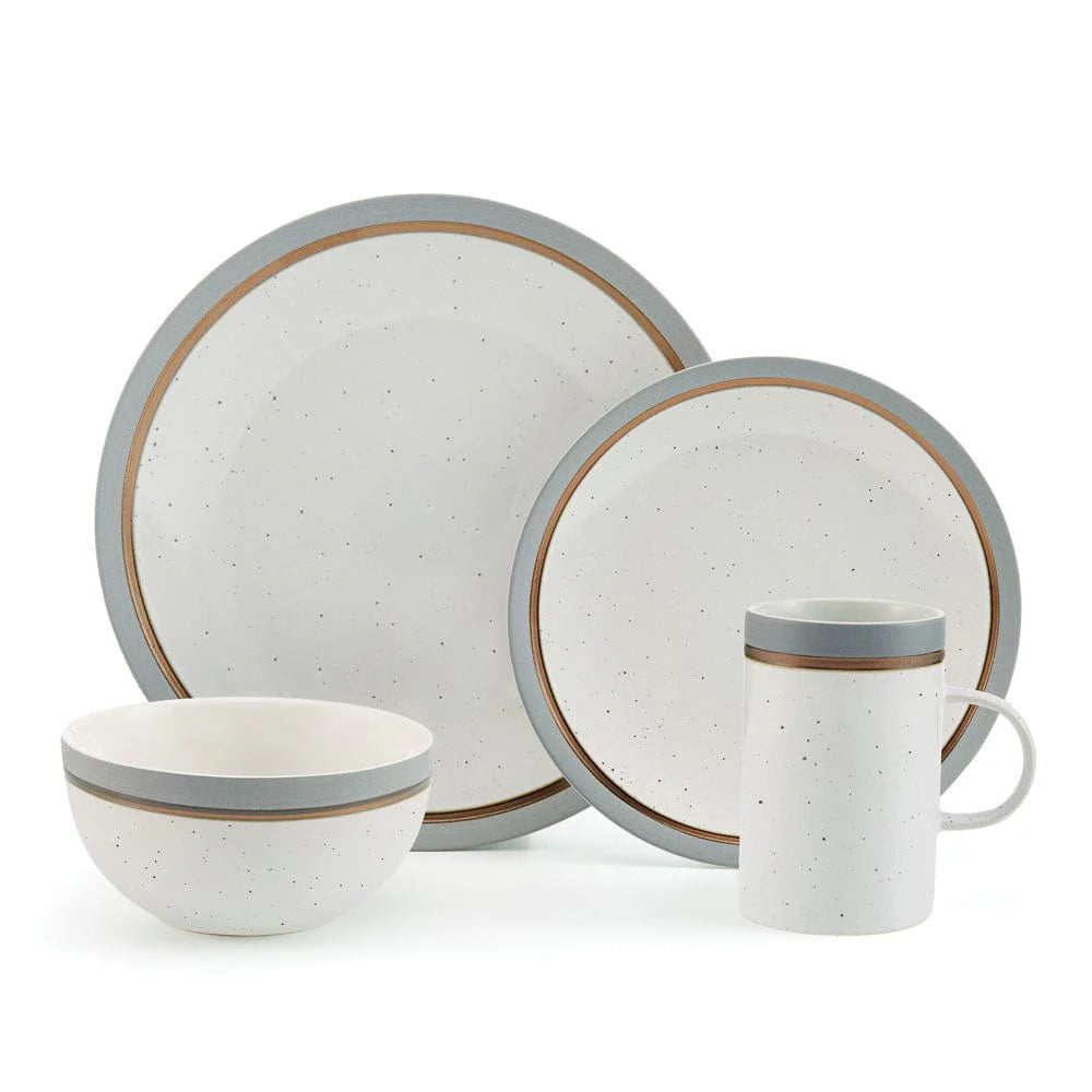 This Pfaltzgraff Ezra Grey Dinnerware Set features a speckle background pattern, with gray and metallic bands around the rim, adding a burst of color and modern allure to your everyday dining.