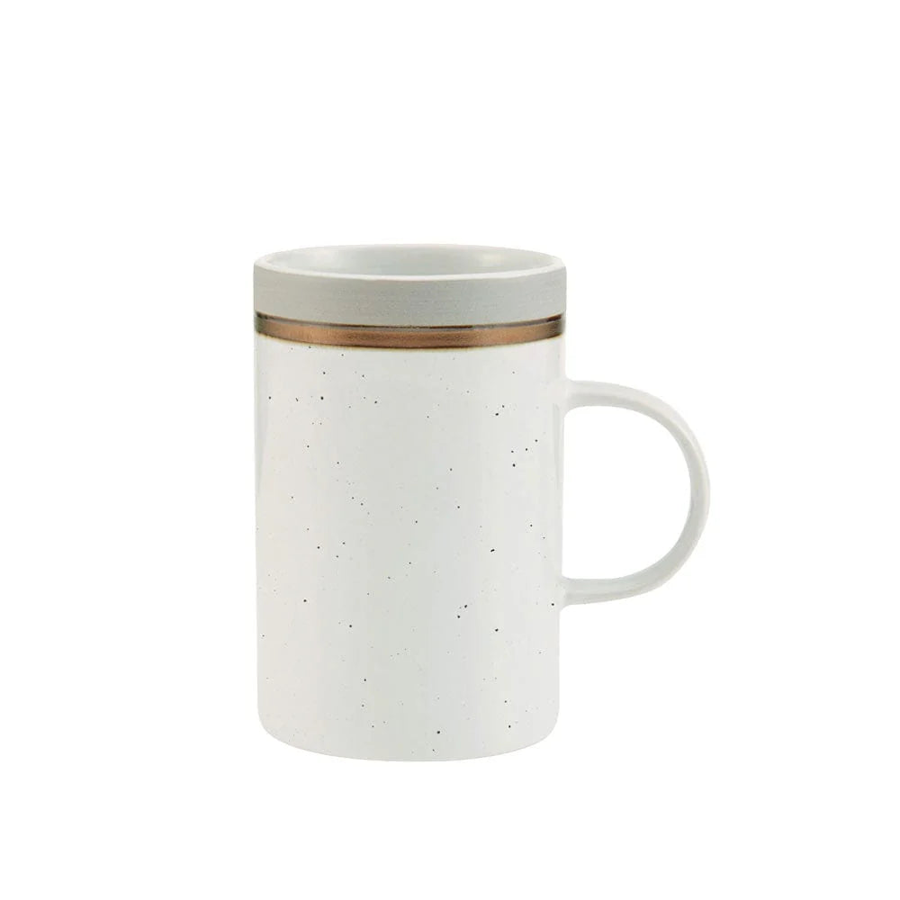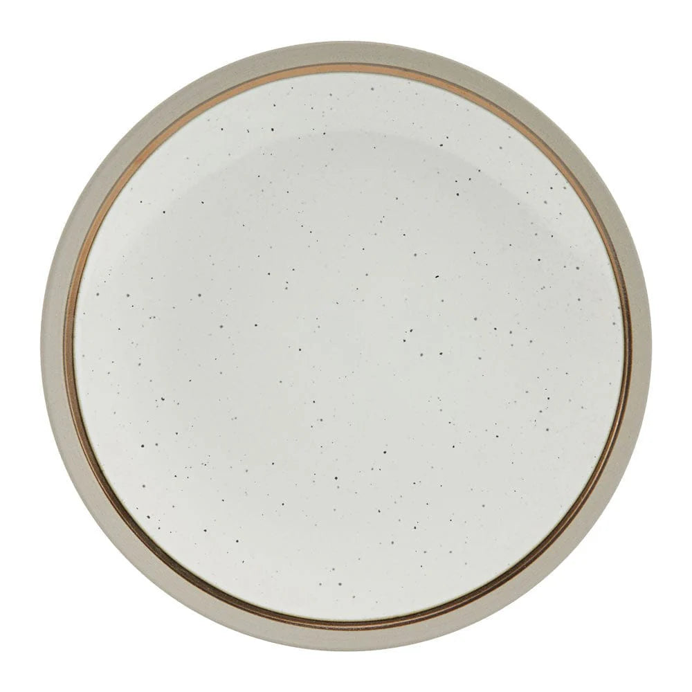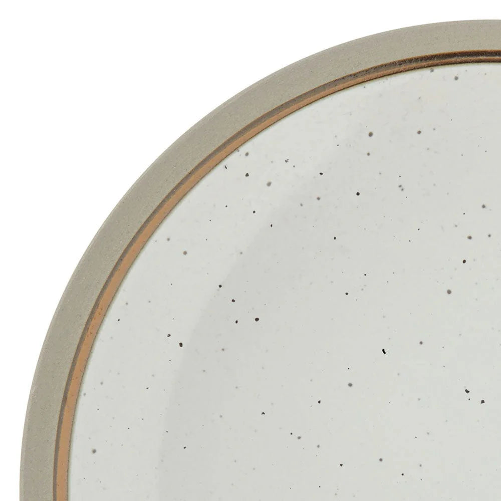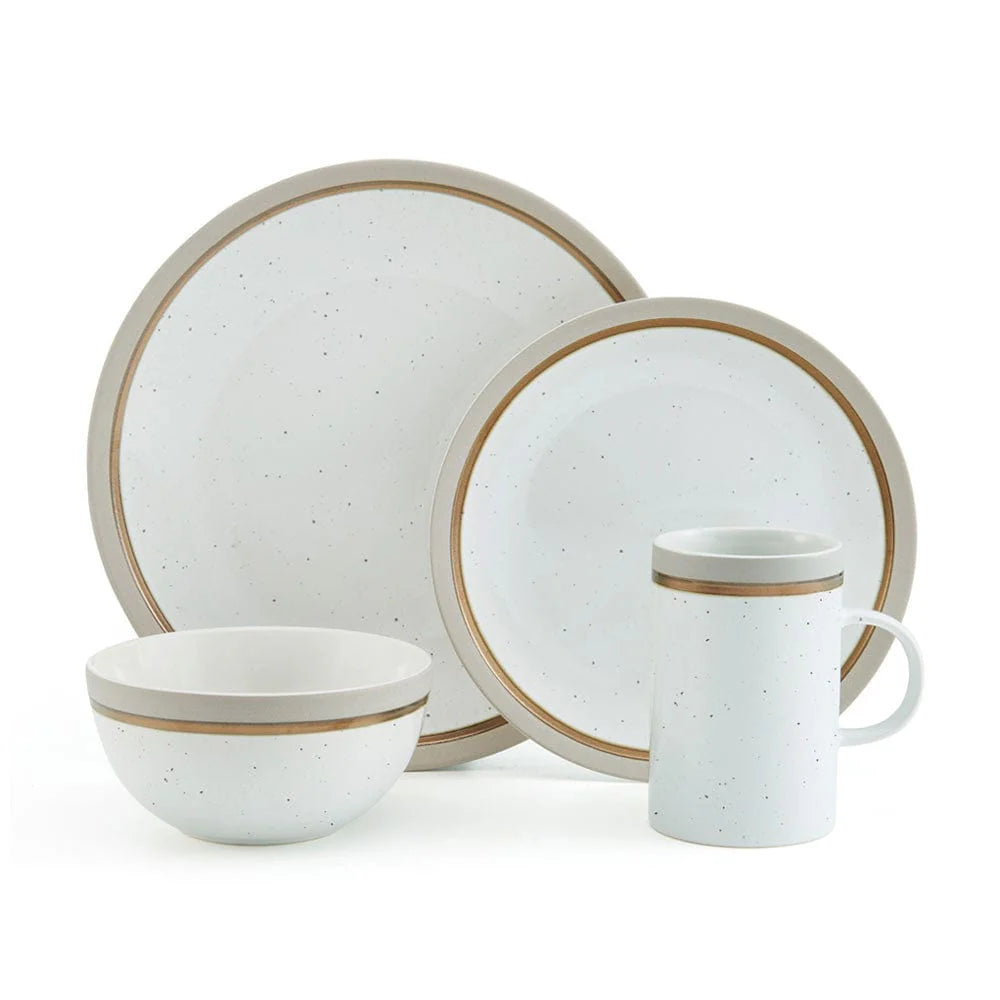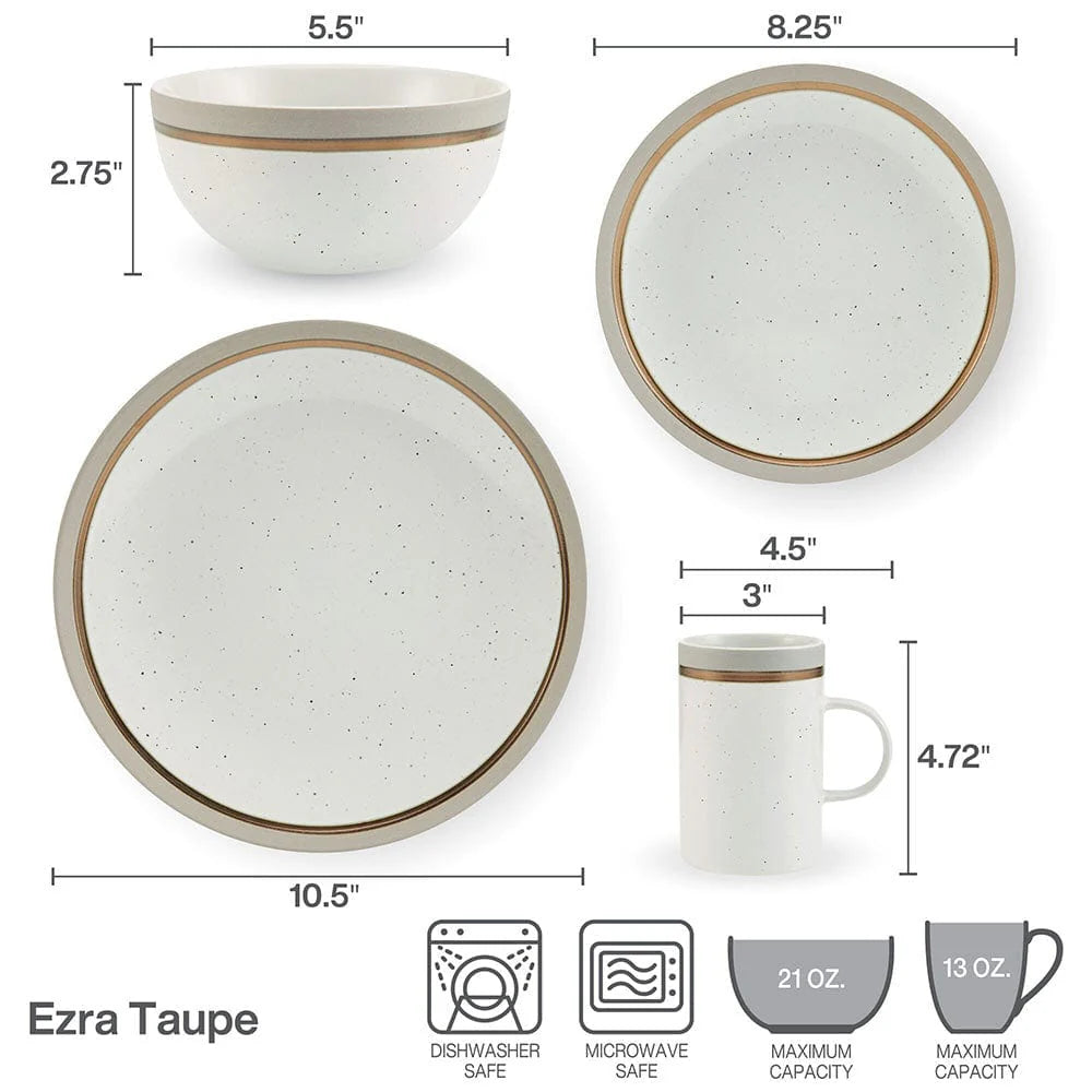 This Pfaltzgraff Ezra Taupe Dinnerware Set features a speckle background pattern, with taupe and metallic bands around the rim, adding bold, vibrant and modern allure to your everyday dining.