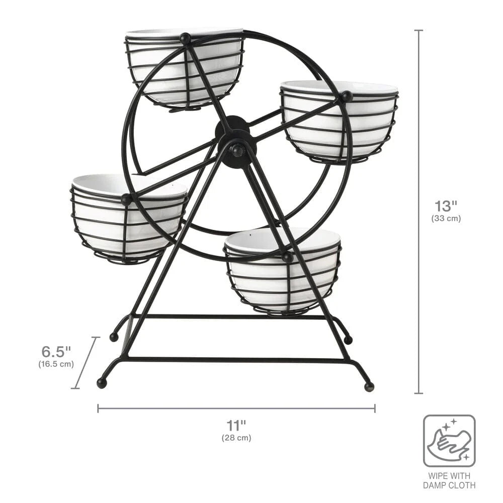 Bring excitement to your buffet table, picnic table, or countertop with this Ferris Wheel Entertaining Caddy. Beautifully crafted of iron with a black wire-framed stand that holds four iron white bowls for a timeless look, this convenient, space-saving caddy turns, allowing for quick, easy access to the contents. Fill the bowls with condiments, use each compartment to serve a variety of snack foods, tea bags, sugar packets, and more.