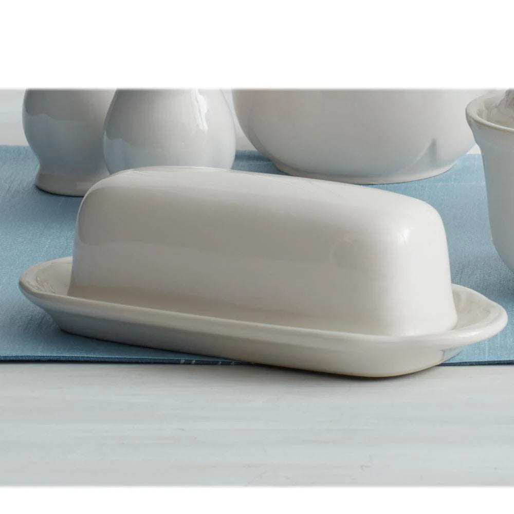 This covered butter dish is perfect for holding a stick of butter or margarine, but if you put cheese on the bottom and turn the top over and add crackers, you have a novel hors d' oeuvre set. Constructed of stoneware. Microwave and dishwasher safe. Covered butter dish holds 1 stick of butter or margarine and measures 7-7/8 inch long.