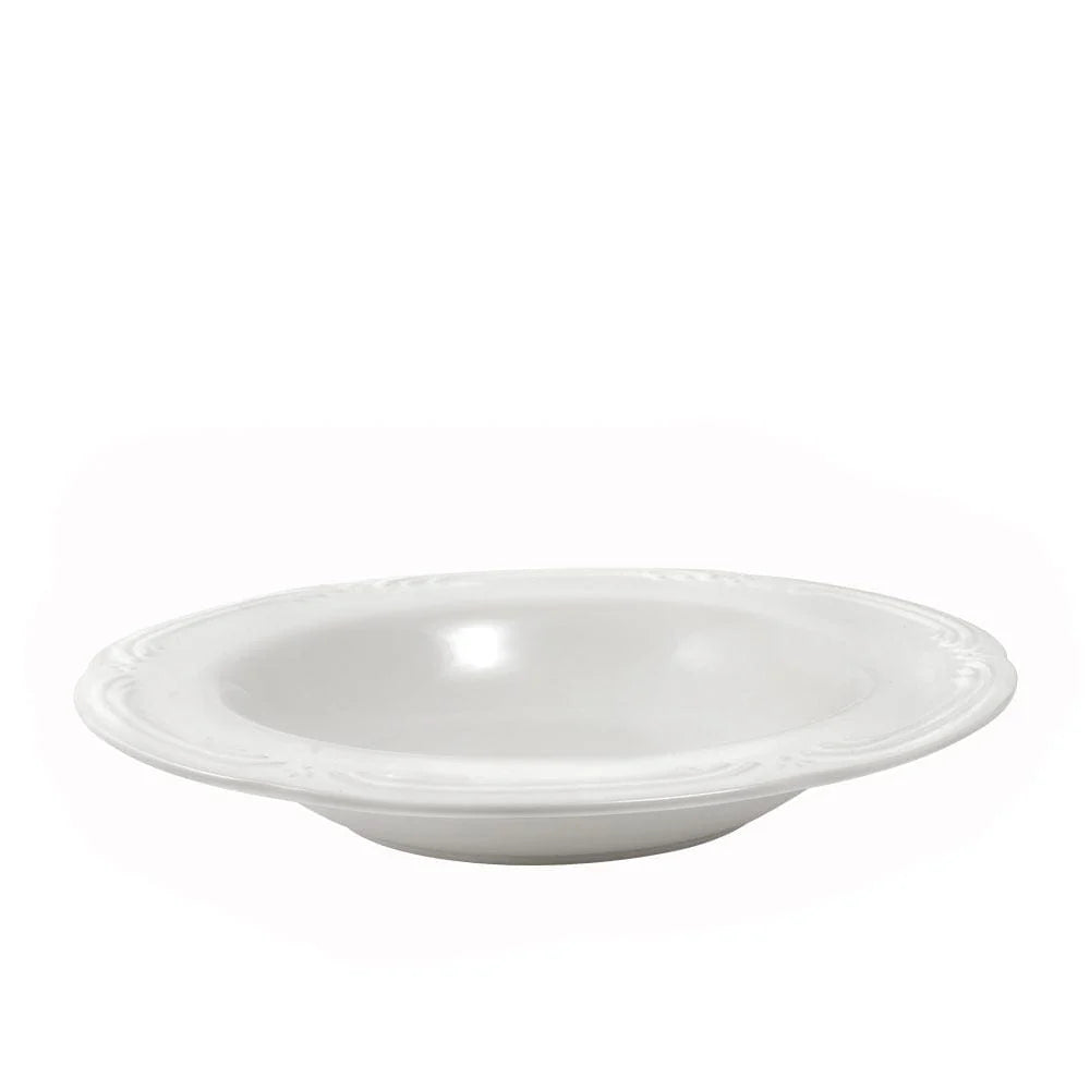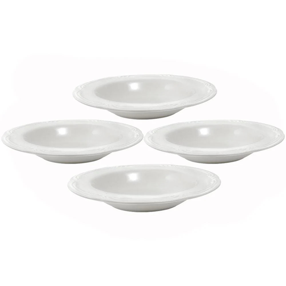 The wide rim on this generous bowl was designed for balancing a piece of bread or crackers to accompany a hearty soup. But youll use this bowl for salads, pasta and even ice cream - this great bowl hold lots of tasty toppings! Crafted of stoneware. Microwave and dishwasher safe. Set of 4 rim soup bowls, each measures 8-1/4 inch diameter x 1-1/2 inch high and holds 10 ounces.