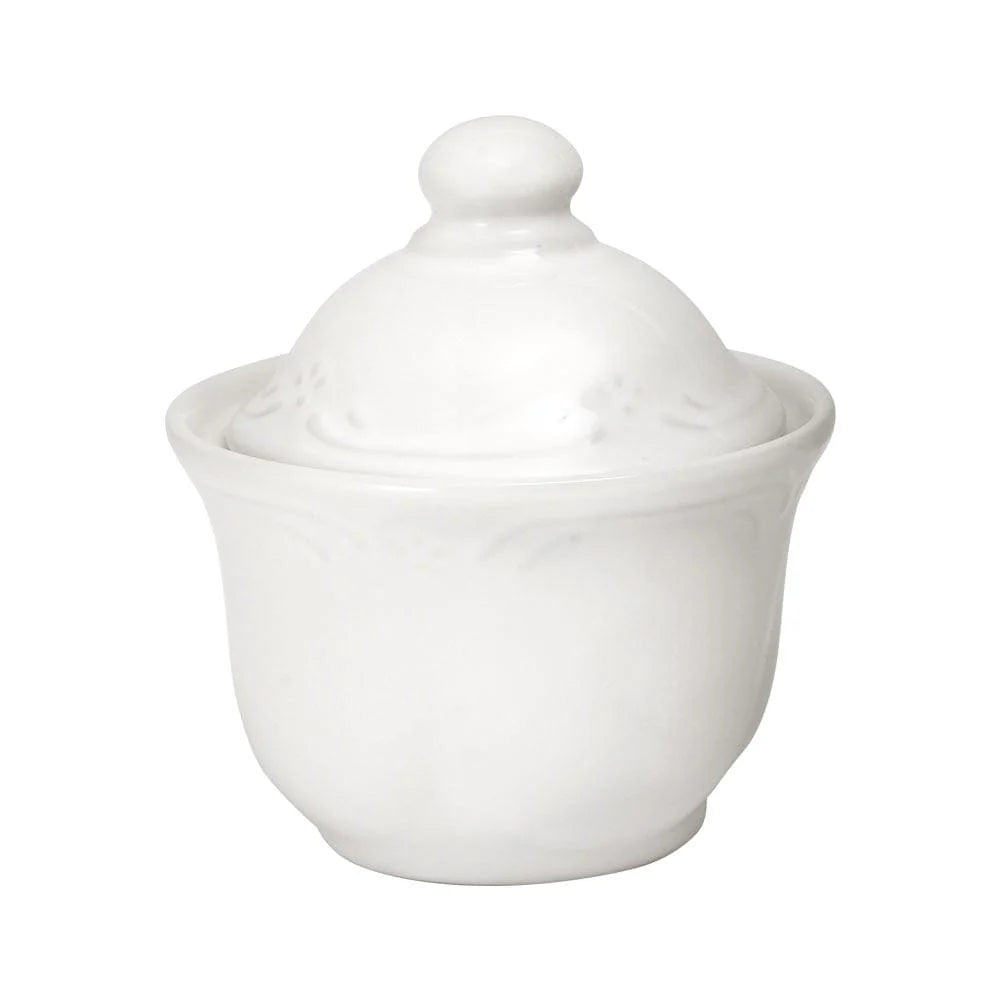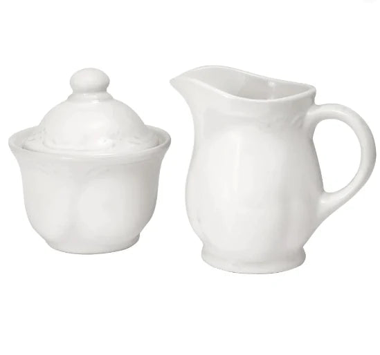 This Filigree Sugar Bowl and Creamer Set is a tribute to the intricate ornamental work of fine artisans, and features embossed detailing that complements the graceful scalloped rim.