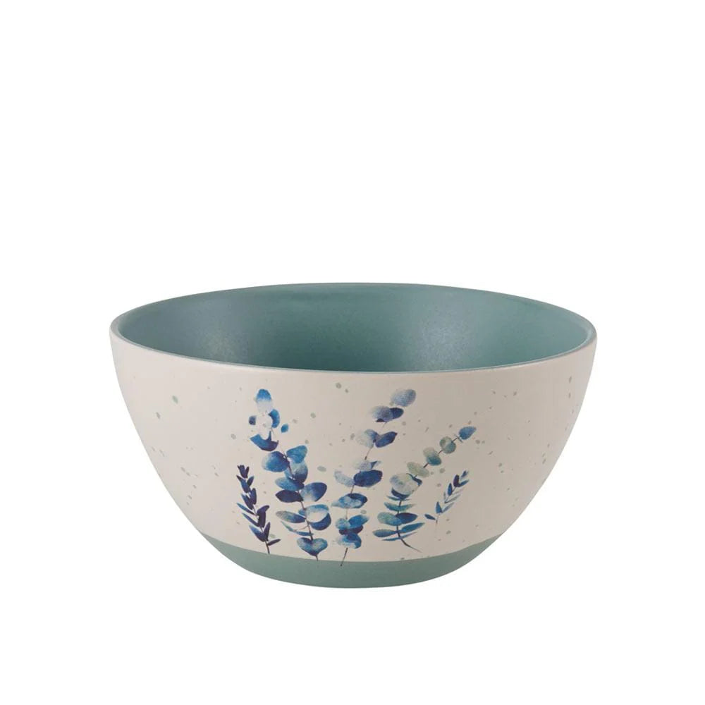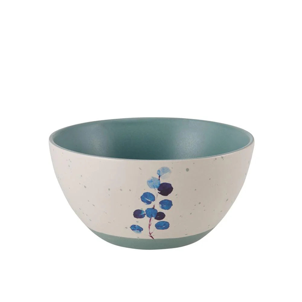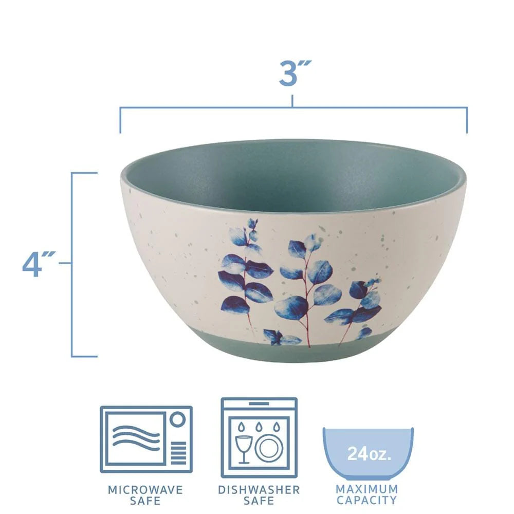 This Pfaltzgraff Floral Blue Set of 6 Soup Cereal Bowls are adorned with distinct, assorted painted leaf decals in vivid blue on a warm cream body with a matte speckled glaze finish.