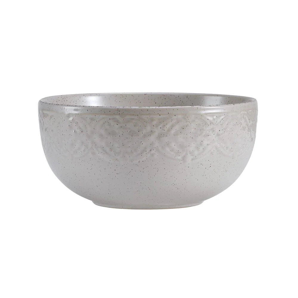 This Gia Dinnerware Set features an embossed rim with a reactive glaze center detail in shades of gray. Due to the nature and hand-crafted qualities of reactive glaze, no two pieces are exactly alike and will exhibit unique variations in color and pattern. Product may slightly differ from image shown.