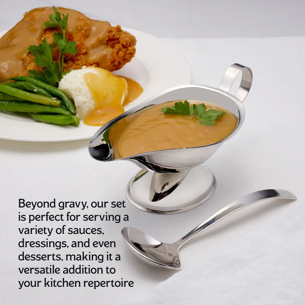 Elevate your dining experience with our premium Stainless Steel Gravy Boat and Ladle Set. Our gravy boat's handle provides a comfortable grip for effortless serving, while the included ladle makes dishing out sauce a breeze. This set combines elegance with practicality, making it a must-have addition to your kitchen arsenal.