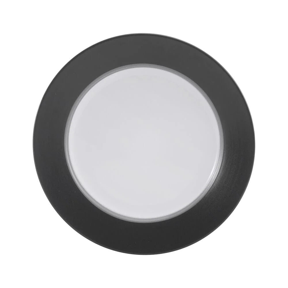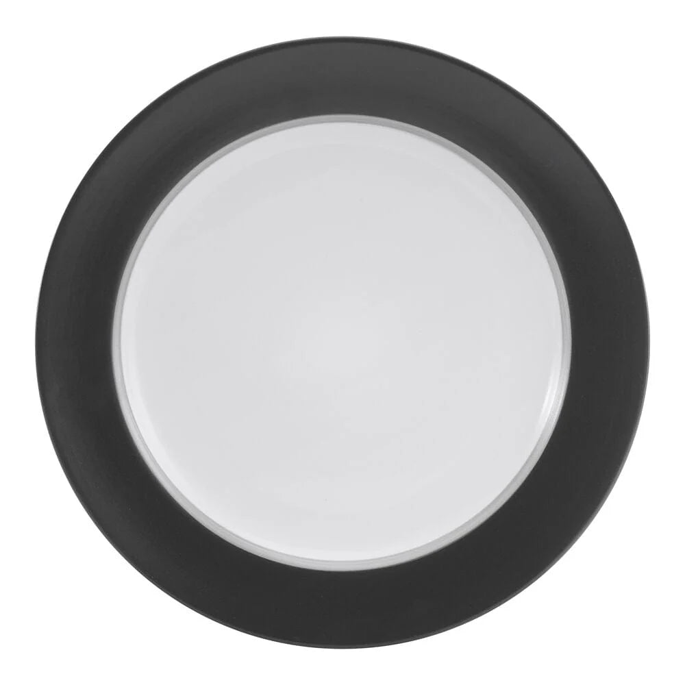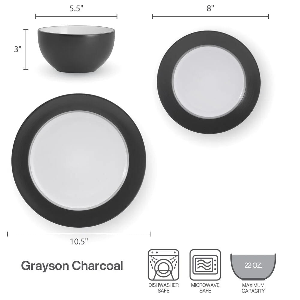 This Grayson Charcoal Dinnerware Set features sleek, simple shapes that are escalated to stylish elegance by white centers and thick solid borders of charcoal accented by a dark charcoal band. This collection will add a contemporary touch to your table.