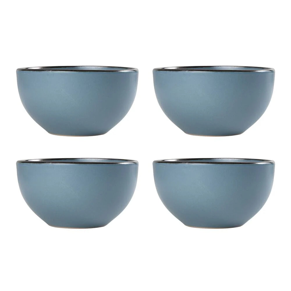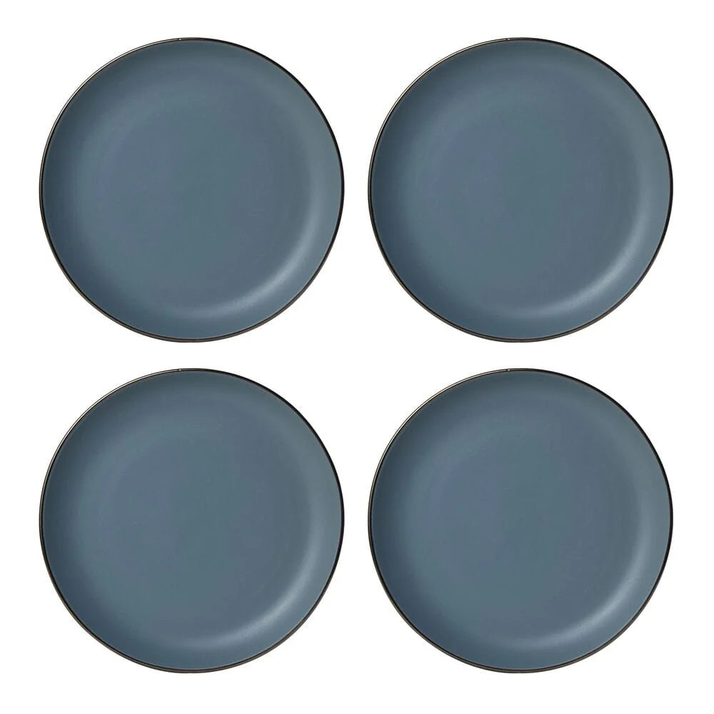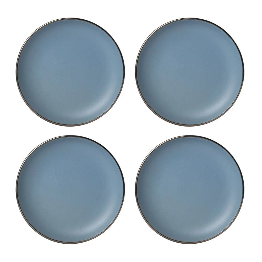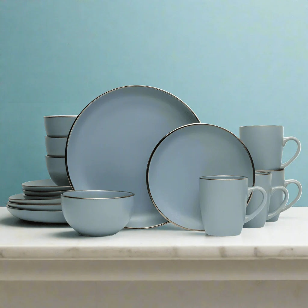 Hadlee Blue features a shimmery bronze band that frames the rims, adding a sleek, modern accent. Crafted of stoneware. 16 piece dinnerware set, service for four, includes (4) each: 10 1/2 inch dinner plate, 8 inch salad plate, 5 1/2 inch wide by 3 inch tall 21 ounce bowl, and 4 inch tall mug 12-1/2 ounce mug. Microwave and dishwasher safe.