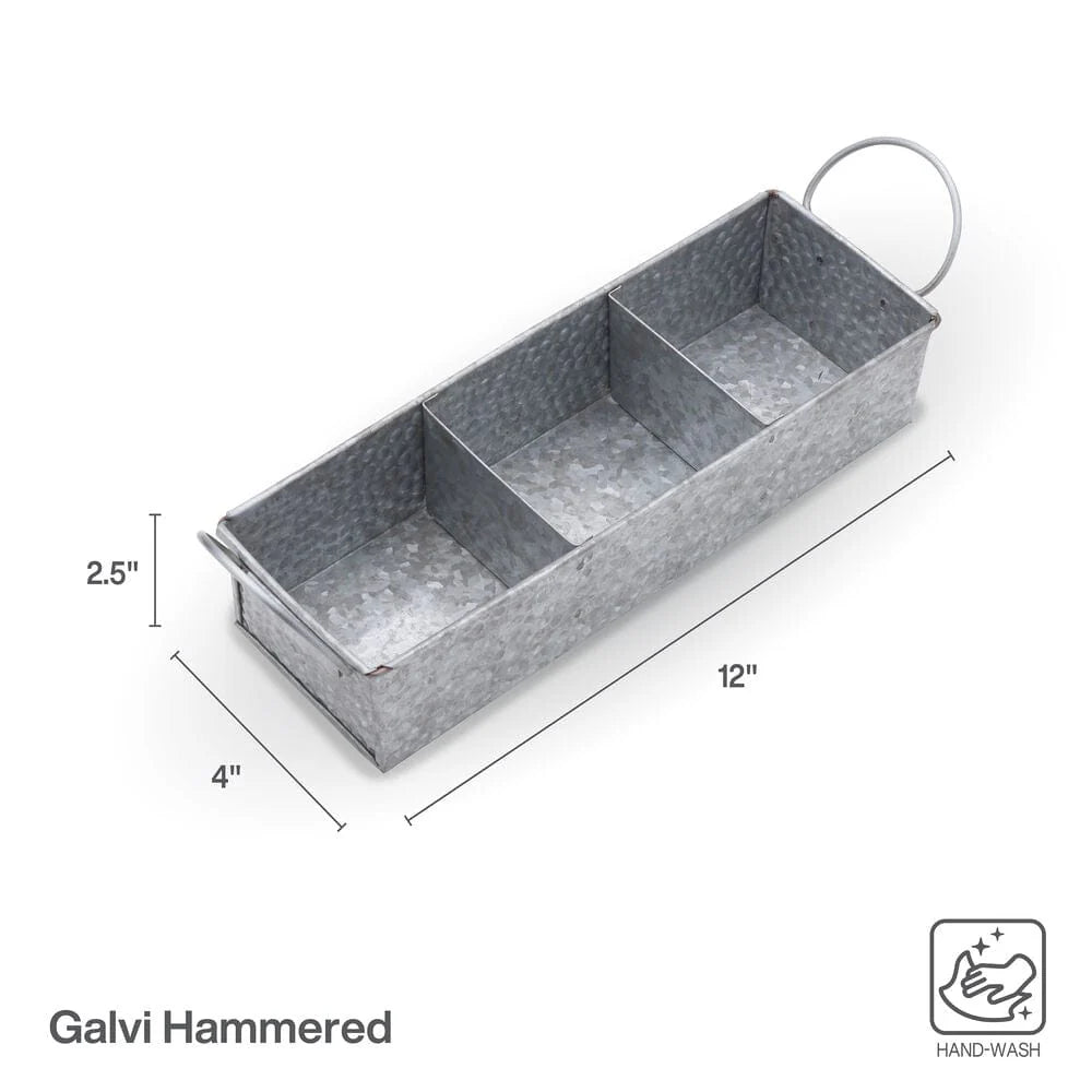 This Hammered Galvanized Metal Divided Tray Caddy is an ideal accent piece on a buffet table or countertop in the home or outside. This metal caddy features three small compartments for utensils.