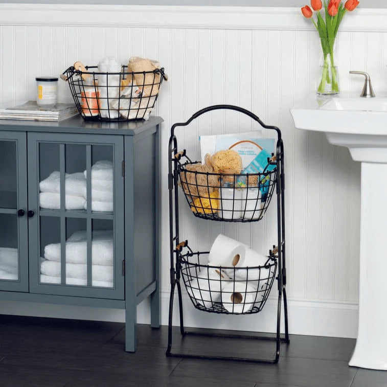 This Harbor 3 Tier Standing Storage Rack with Market Baskets is a practical and stylish storage solution that will bring organization to any room in your home. Standing Rack is adjustable to hold 2 or 3 baskets. Features an antique black brushed copper design. Handcrafted from iron for long lasting beauty even under rigorous use. Wipe clean with damp cloth. Storage Rack measures 47-5/8 inches high x 11-1/8 inches wide x 15-1/2 inches long; each basket measures 13-1/2 inches long x 10 inches wide x 7-1/2 inches high. This product contains Carbon Black. For more information about chemicals in this product, visit www.lifetimebrands.com/ab1200