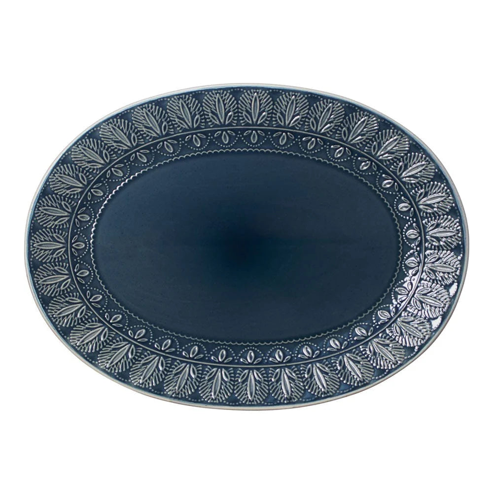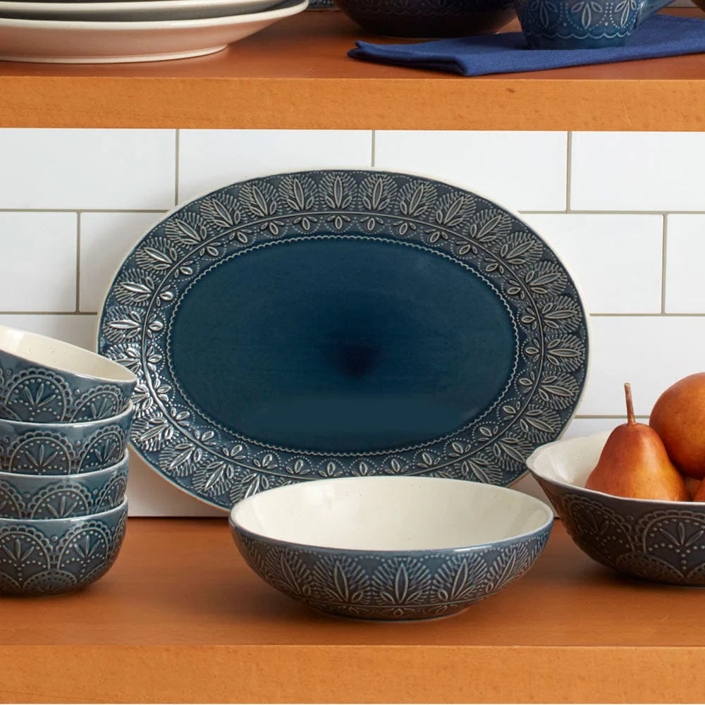 This Pfaltzgraff Havana Oval Platter features a classic, jeweled tone blue backdrop with an embossed pattern, and a reactive glaze finish. Due to the nature and hand-crafted qualities of reactive glaze, no two pieces are exactly alike and will exhibit unique variations in color and pattern. Product may slightly differ from image shown.