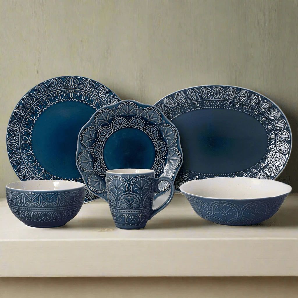 This Pfaltzgraff Havana Service for 8 with Serveware features a classic, jeweled tone blue backdrop with an embossed pattern, and a reactive glaze finish. Due to the nature and hand-crafted qualities of reactive glaze, no two pieces are exactly alike and will exhibit unique variations in color and pattern. Product may slightly differ from image shown.