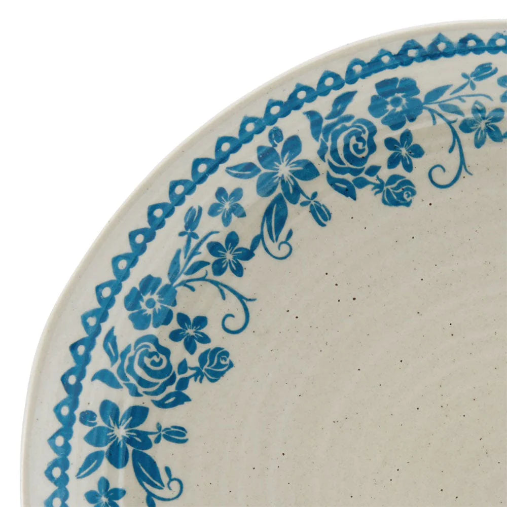 Hayden Blue dinnerware set is uniquely crafted with subtle organic shaped plates and bowls with concentric ribbed design and a delicate floral motif. Each piece brings a natural elegance to everyday dining.