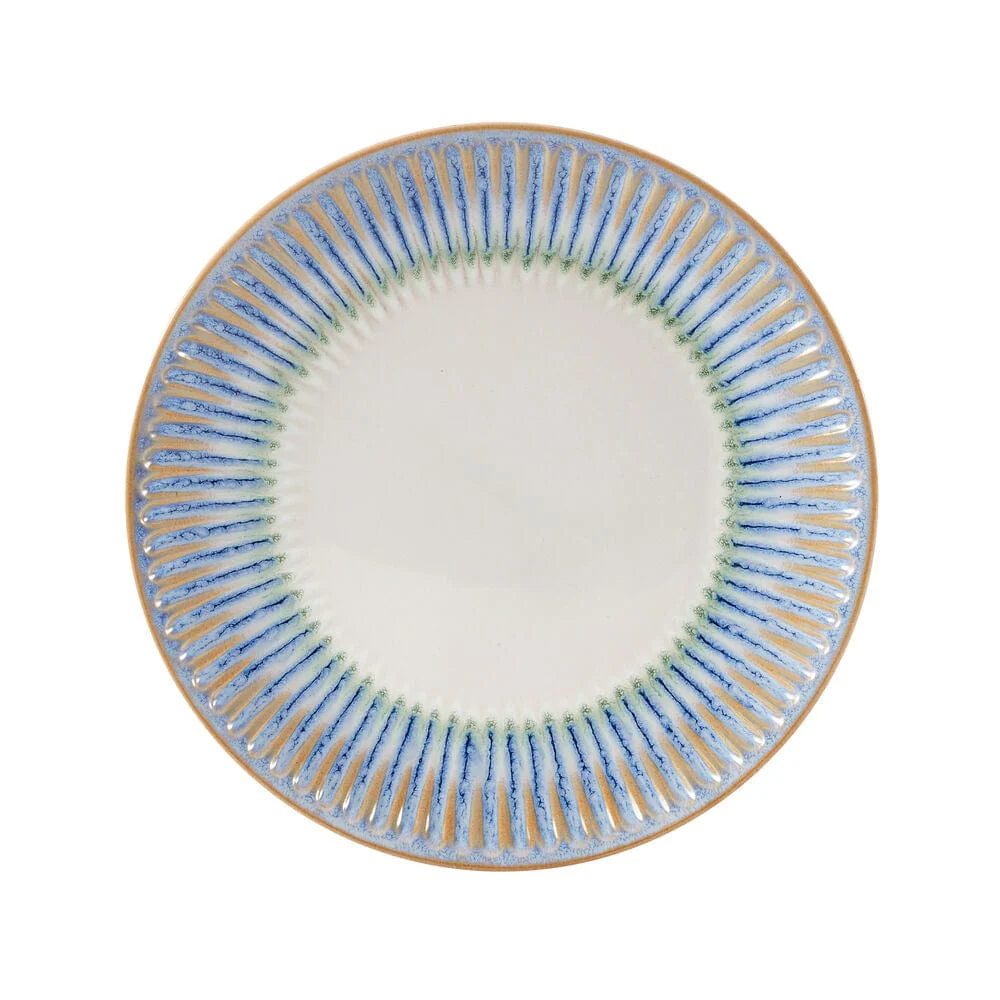 This Hensley Blue Dinnerware Set features white centers, bordered by an embossed ridge pattern in a vivid shade of blue, with an inner ring of green, and a reactive glaze finish. Due to the nature and hand-crafted qualities of reactive glaze, no two pieces are exactly alike and will exhibit unique variations in color and pattern. Product may slightly differ from image shown.