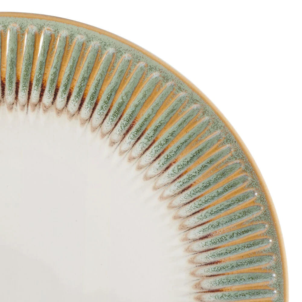 This Hensley Green Dinnerware Set features white centers, bordered by an embossed ridge pattern in an earthy shade of green, and a reactive glaze finish. Due to the nature and hand-crafted qualities of reactive glaze, no two pieces are exactly alike and will exhibit unique variations in color and pattern. Product may slightly differ from image shown.