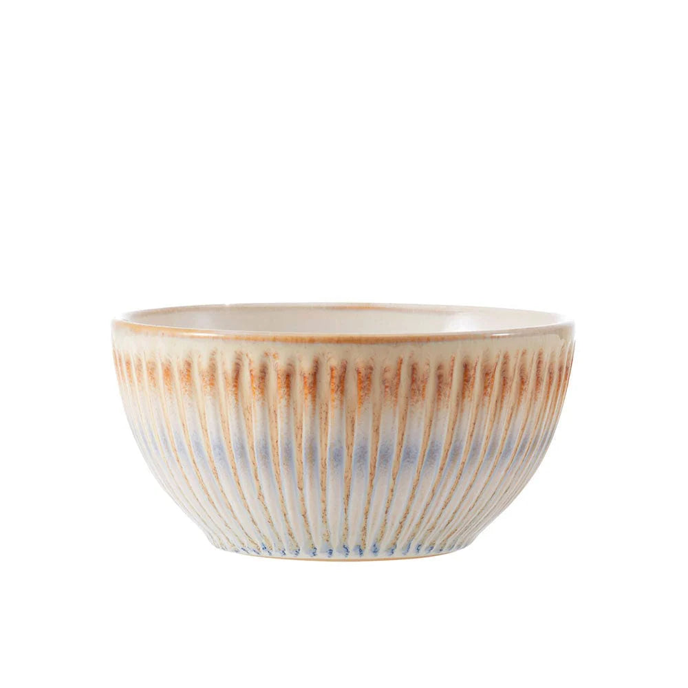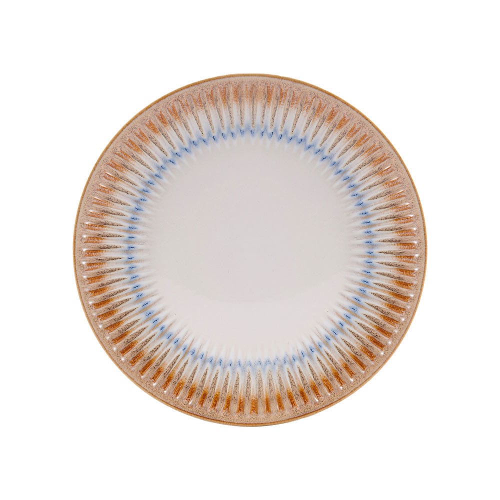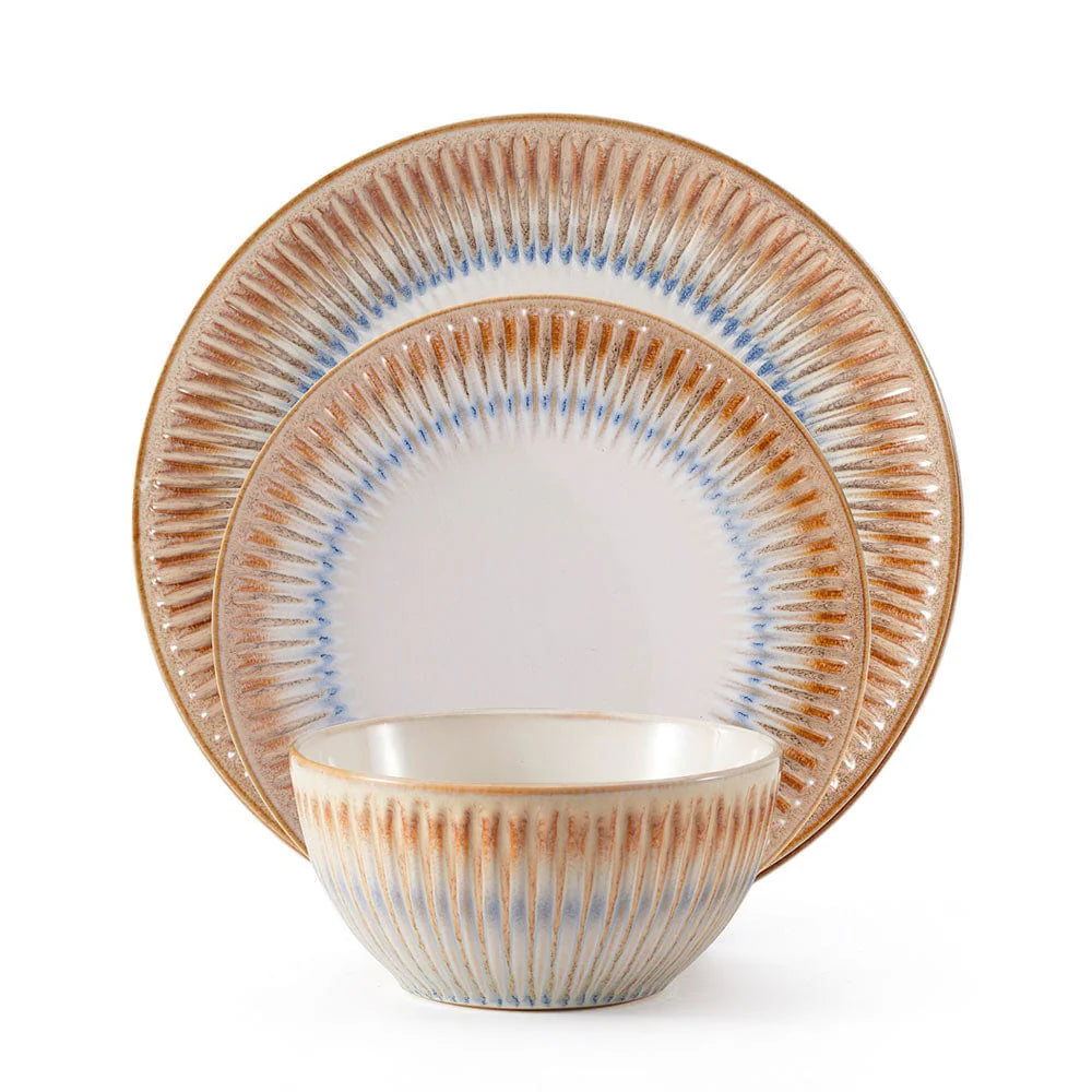 This Hensley Taupe Dinnerware Set features white centers, bordered by an embossed ridge pattern in a warm shade of brown, with an inner ring of muted blue, and a reactive glaze finish. Due to the nature and hand-crafted qualities of reactive glaze, no two pieces are exactly alike and will exhibit unique variations in color and pattern. Product may slightly differ from image shown.
