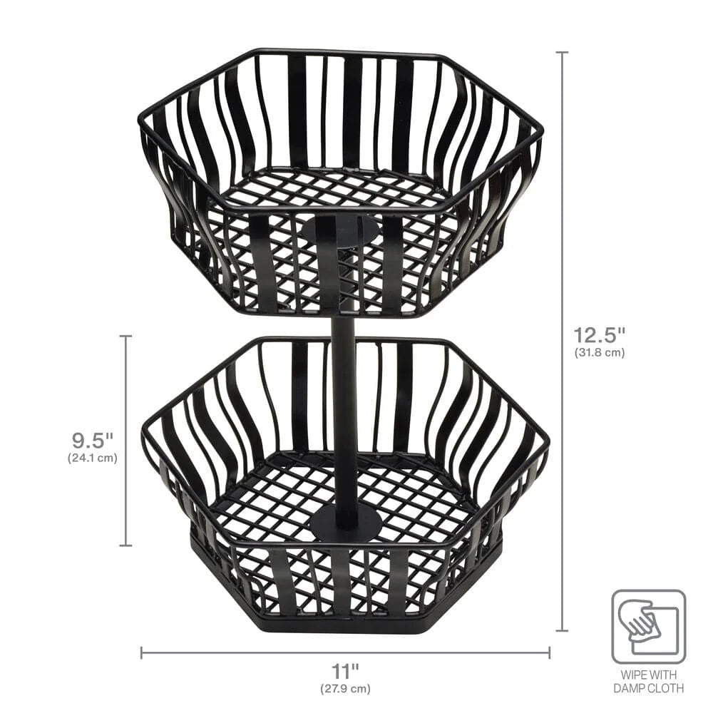 From the Gourmet Basics by Mikasa Collection, this Hex 2 Tier Basket can hold multiple items while taking up minimal counter or table space. Air flows through the open-wire design allowing fruits to ripen evenly, and the black finish will compliment any décor.