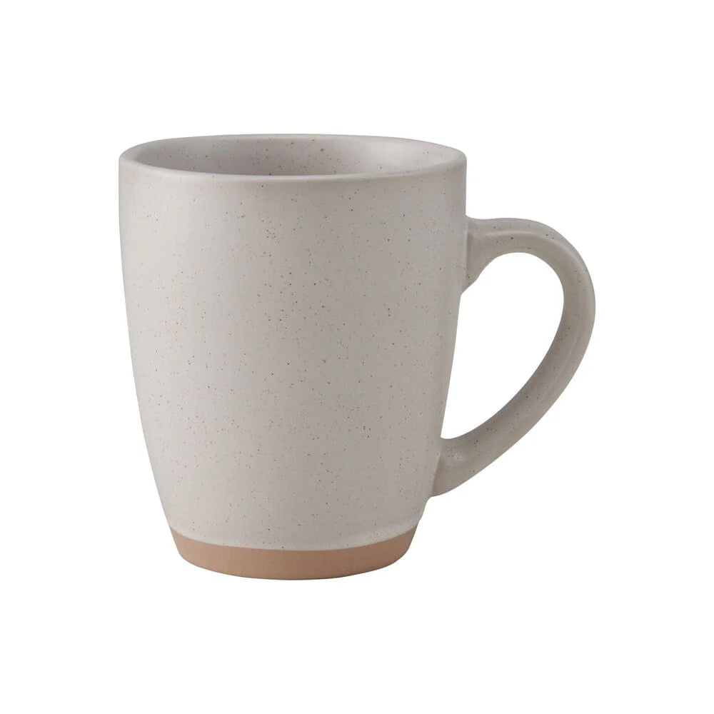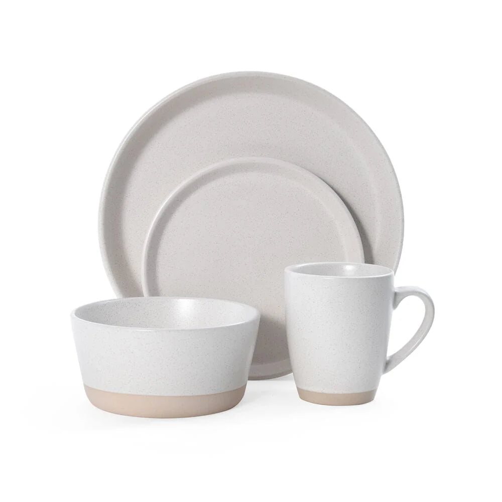 Crafted of high-quality stoneware for strength and durability, this collection in a soft beige color features contemporary coupe shapes with unique high walls bordering the plates, and a distinct, cream band encircling the bases of the bowl and mug. 16-piece set, service for 4, includes 4 each of: 10-1/2 inch dinner plate, 7-1/2 inch salad plate, 5-1/2 inch cereal bowl, and 12-ounce mug. Microwave and dishwasher safe.