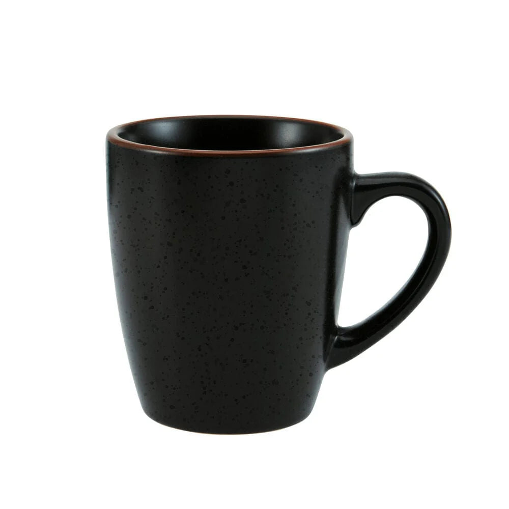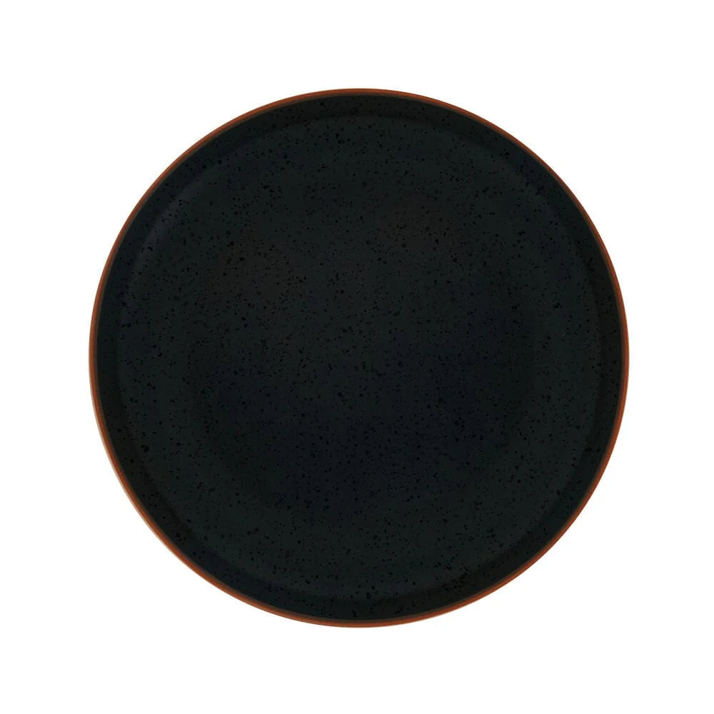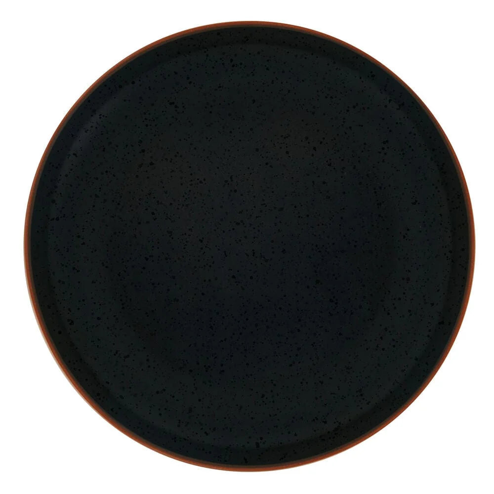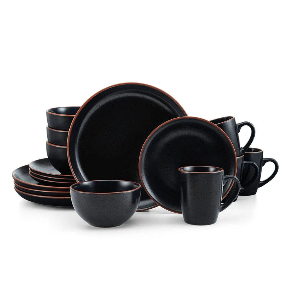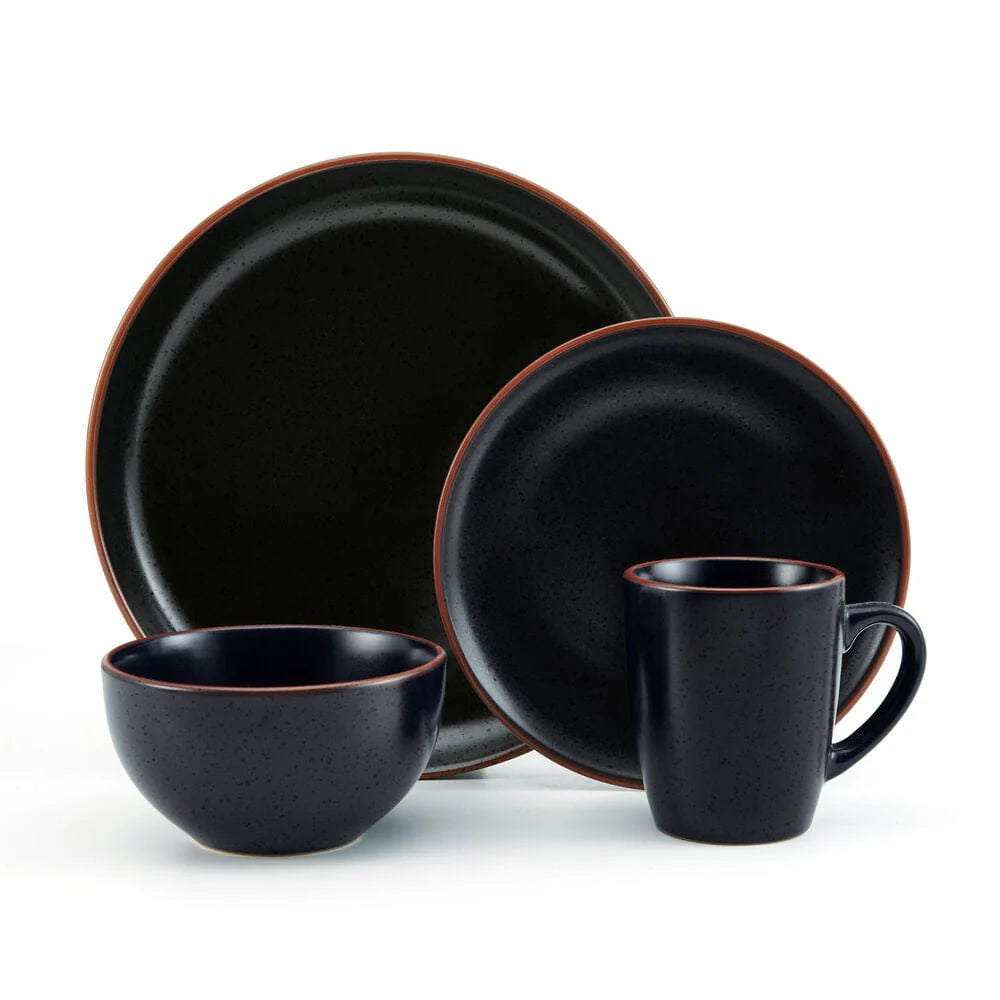 This Pfaltzgraff Hunter Black Dinnerware Set features a semi-matte black glaze finish, with contrasting glossy speckles and a striking earth tone band around the rims, it will bring bold, modern style to any dining occasion.
