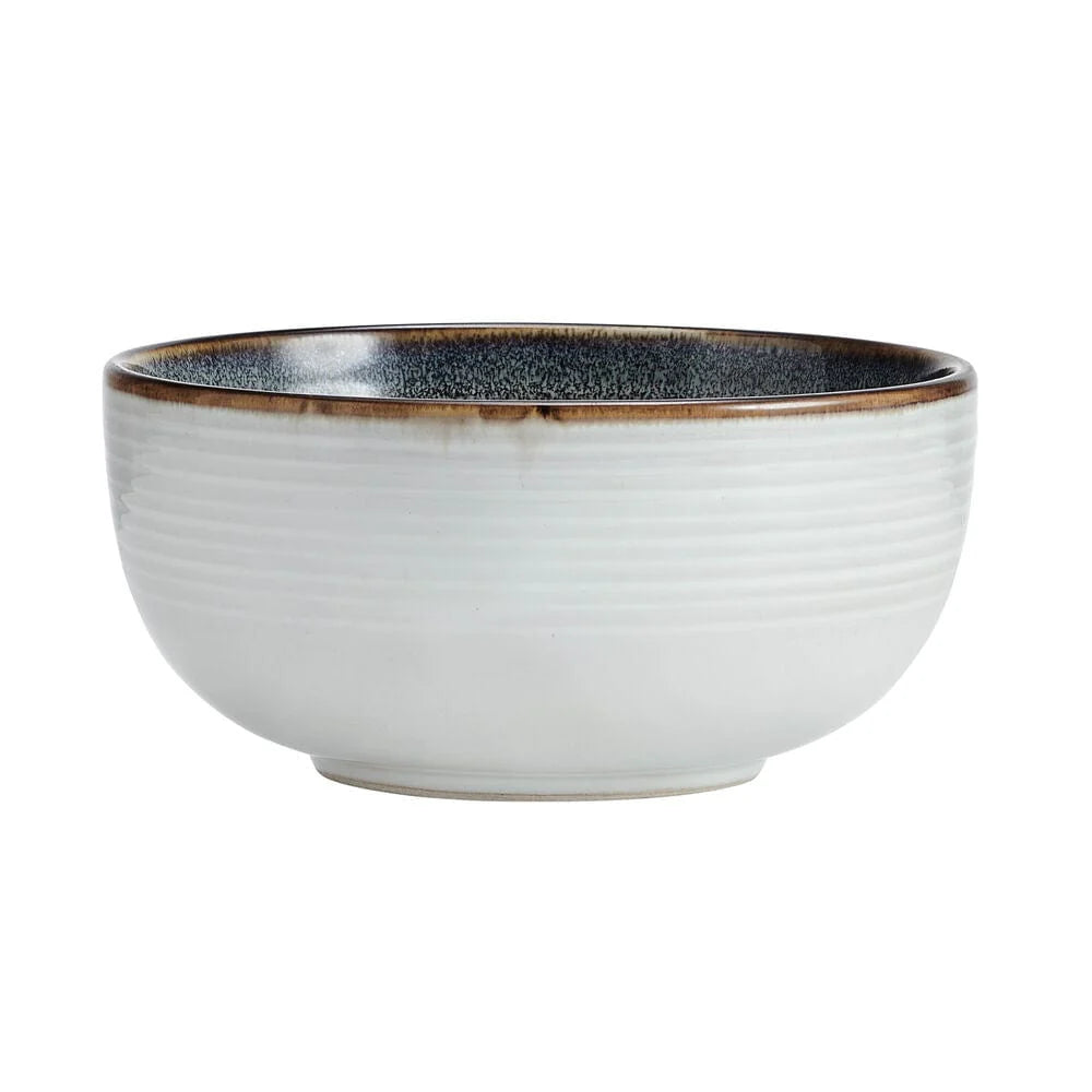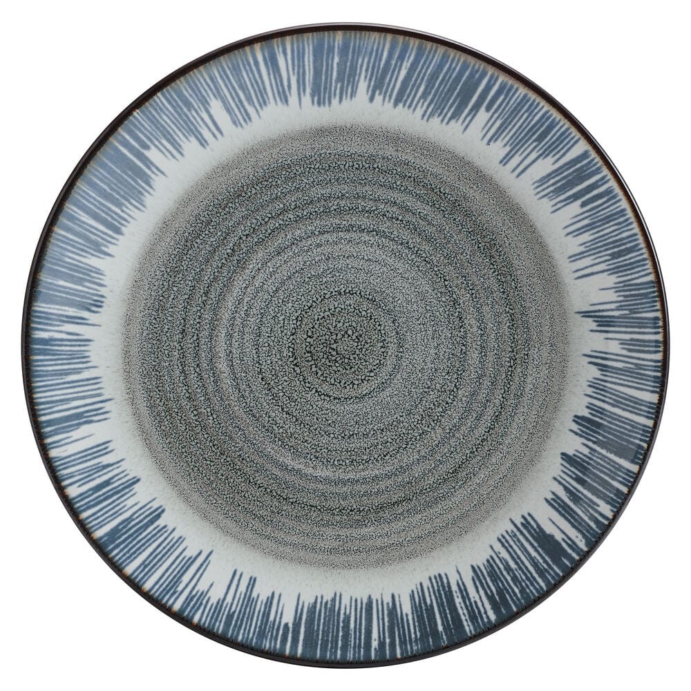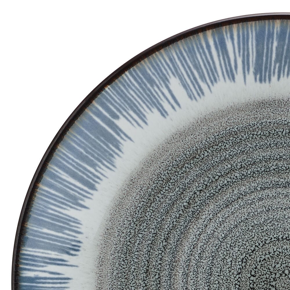 This Jaimie Dinnerware Set features simple shapes that are escalated to stylish elegance by a grey center and a thick blue and brown border, on a reactive glaze finish. Due to the nature and hand-crafted qualities of reactive glaze, no two pieces are exactly alike and will exhibit unique variations in color and pattern. Product may slightly differ from image shown.