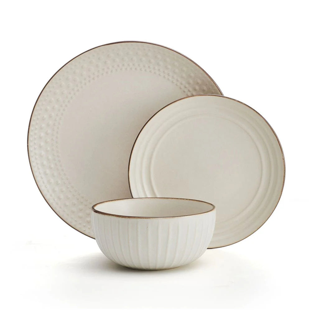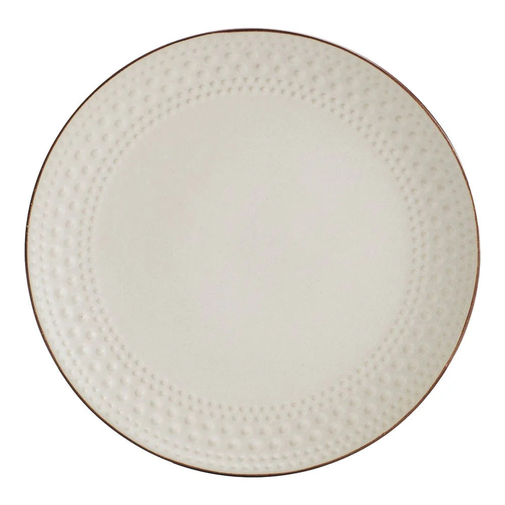 This Janelle Dinnerware Set features a varying embossed line and bead design around each piece, with a creamy reactive glaze and a semi-matte glaze body. Due to the nature and hand-crafted qualities of reactive glaze, dinnerware will exhibit slight and unique variations in color.