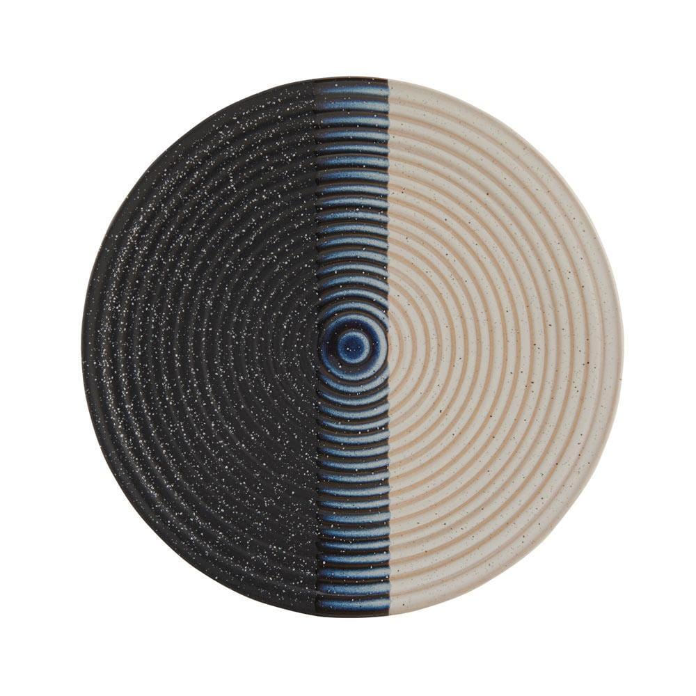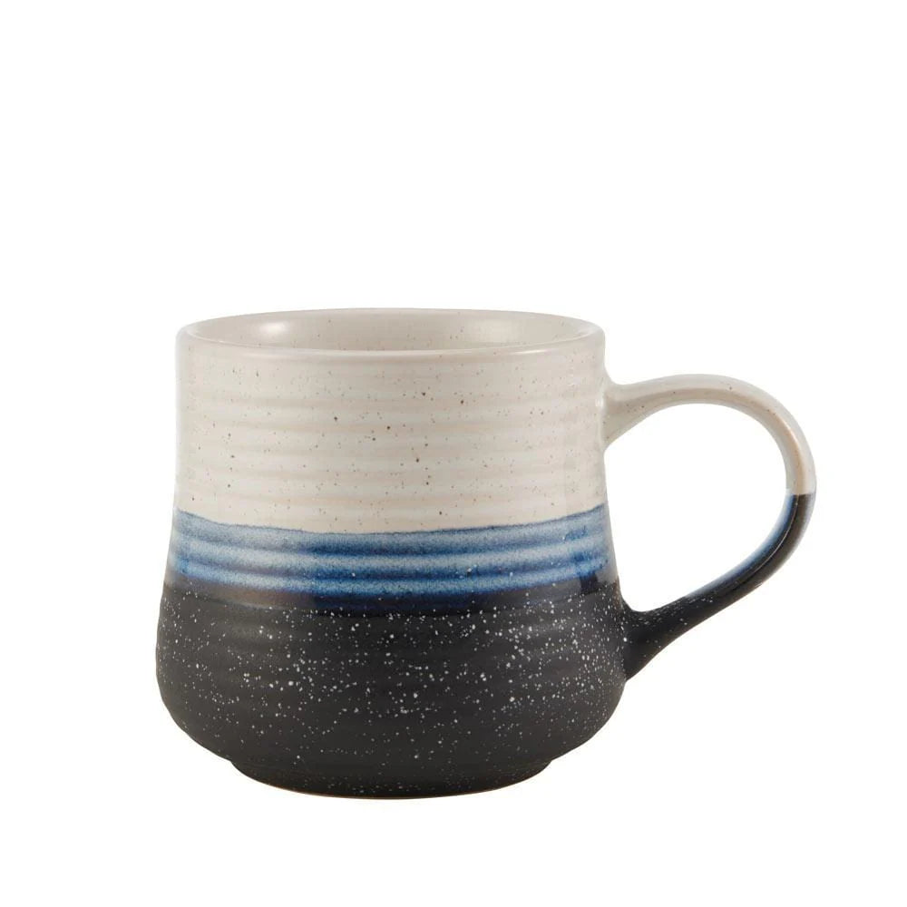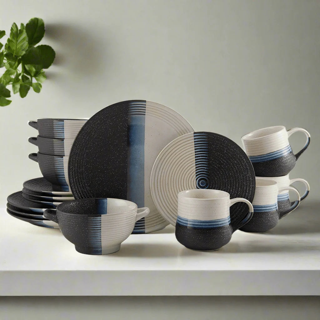 This Pfaltzgraff Jaxon Dinnerware Set is stunningly unique and contemporary, brining modern sophistication to your tabletop. Each piece in the collection moves from bright white to a band of deepening blue before arriving at charcoal black. Striated lines encircle each piece, and a distinct speckle effect is enhanced by a reactive glaze finish. Due to the nature and hand-crafted qualities of reactive glaze, no two pieces are exactly alike and will exhibit unique variations in color and pattern. Product may slightly differ from image shown. 16 piece Dinnerware set, service for four, includes (4) each : 10 inch dinner plate, 8-1/2 inch salad plate, 6 inch diameter soup cereal bowl, and 12 fluid ounce mug. Microwave and dishwasher safe.