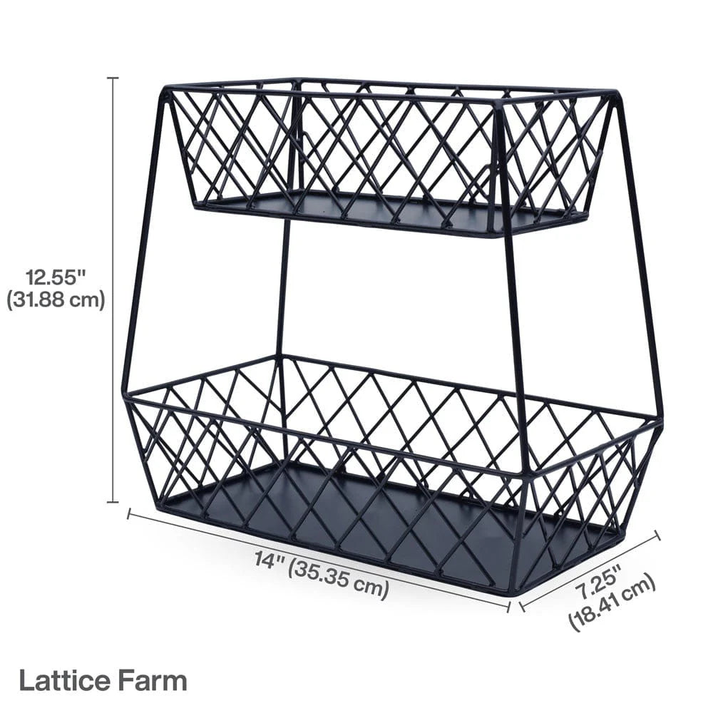 From the Gourmet Basics by Mikasa Collection, this Lattice Farm Flat Back 2 Tier Storage Basket features a 2-teir design, black finish with intricate lattice details, and allows you to store multiple items while taking up minimal counter or table space. The flat back design allows the basket to sit perfectly against the wall to save counter space.