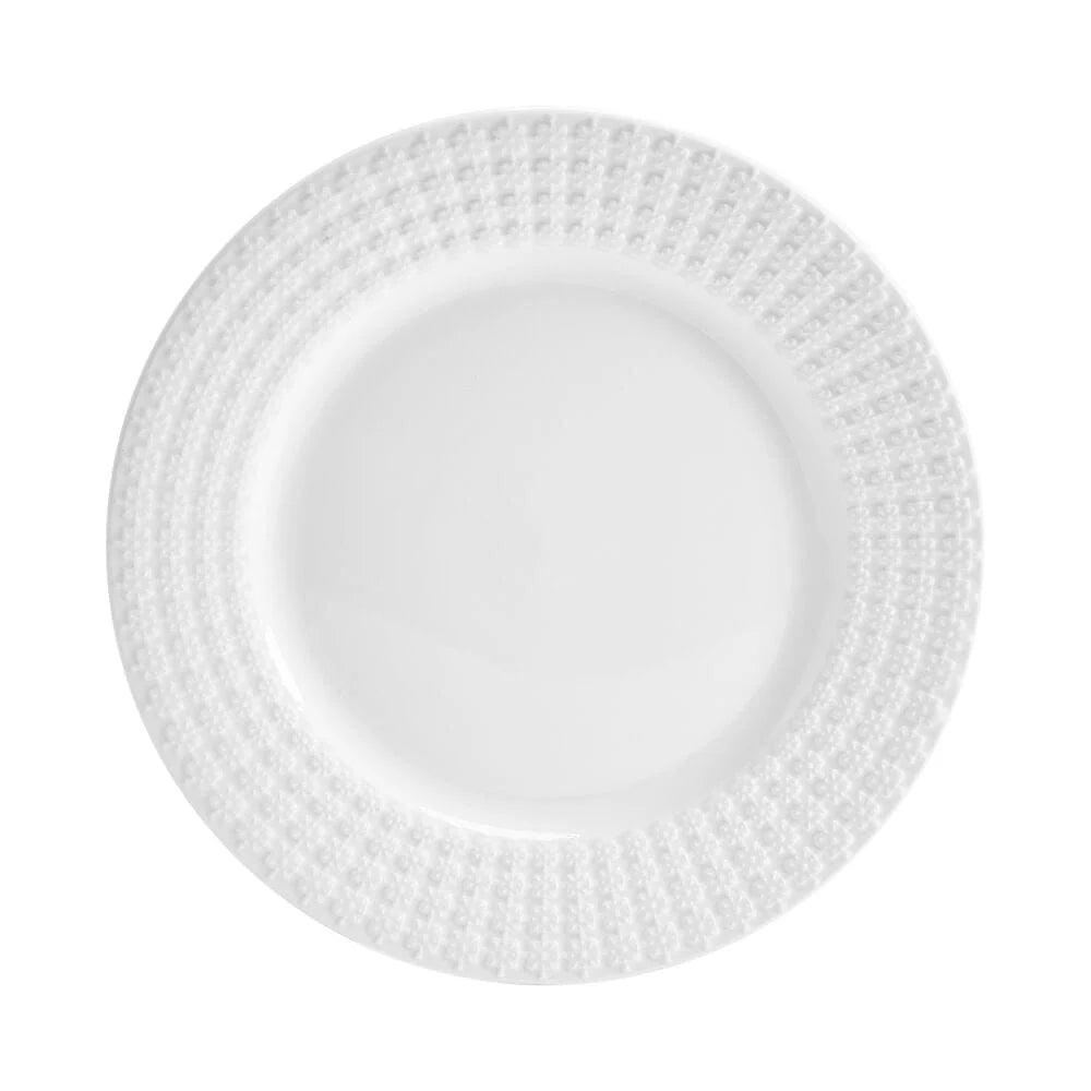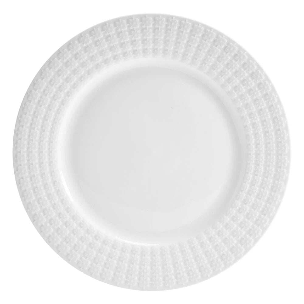 This Lexi Dinnerware Set features a crisp white background with a square embossed design on the rim, will add a modern and whimsical addition to your dining table, and is perfect for everyday dining or light entertaining.